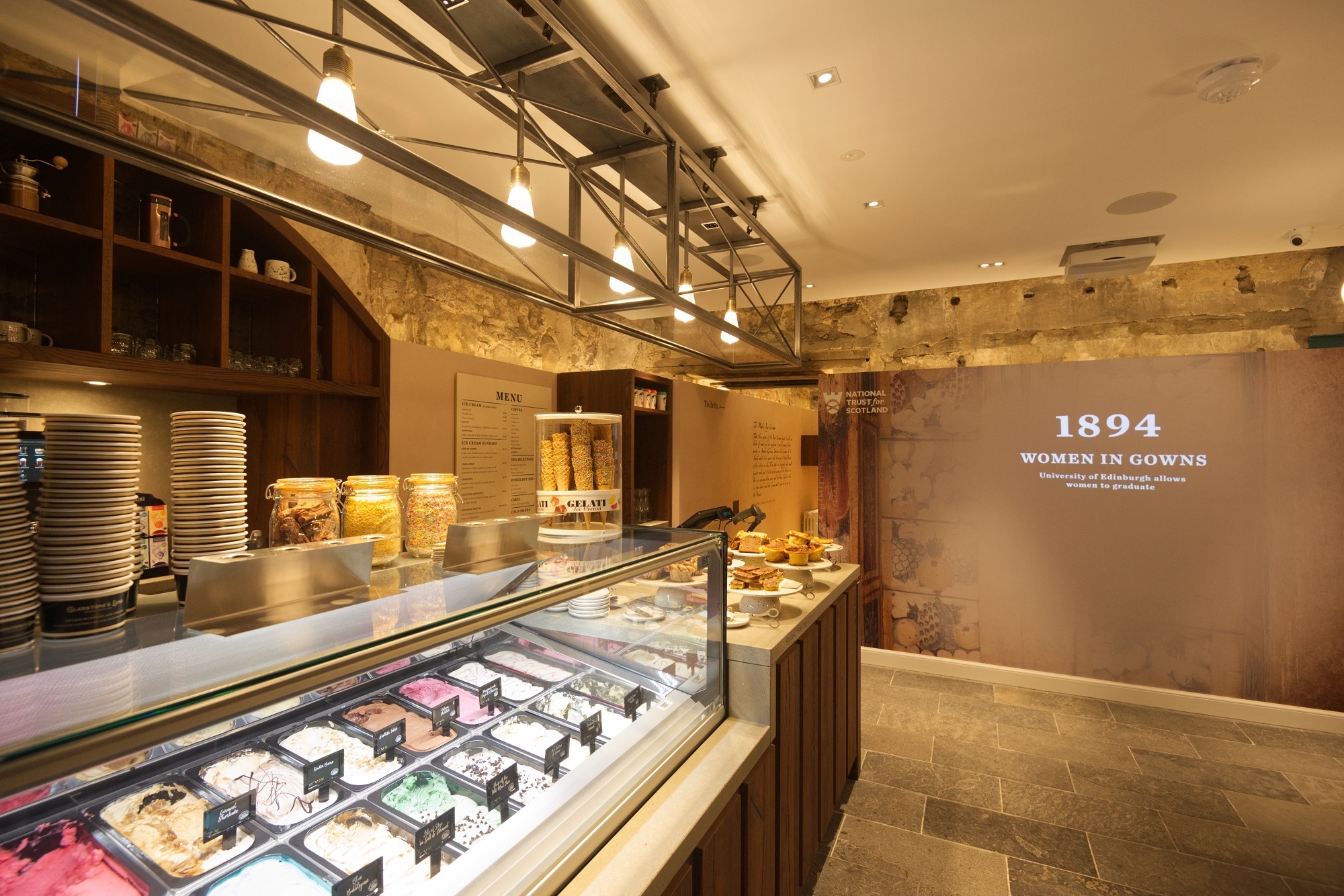 The modern coffee shop and ice cream parlour offers a variety of cakes, ice cream flavours, hot and cold drinks, and seasonal specialities. It was once the main shop area for the merchants of Gladstone’s Land and features interpretation to connect visitors to its past.