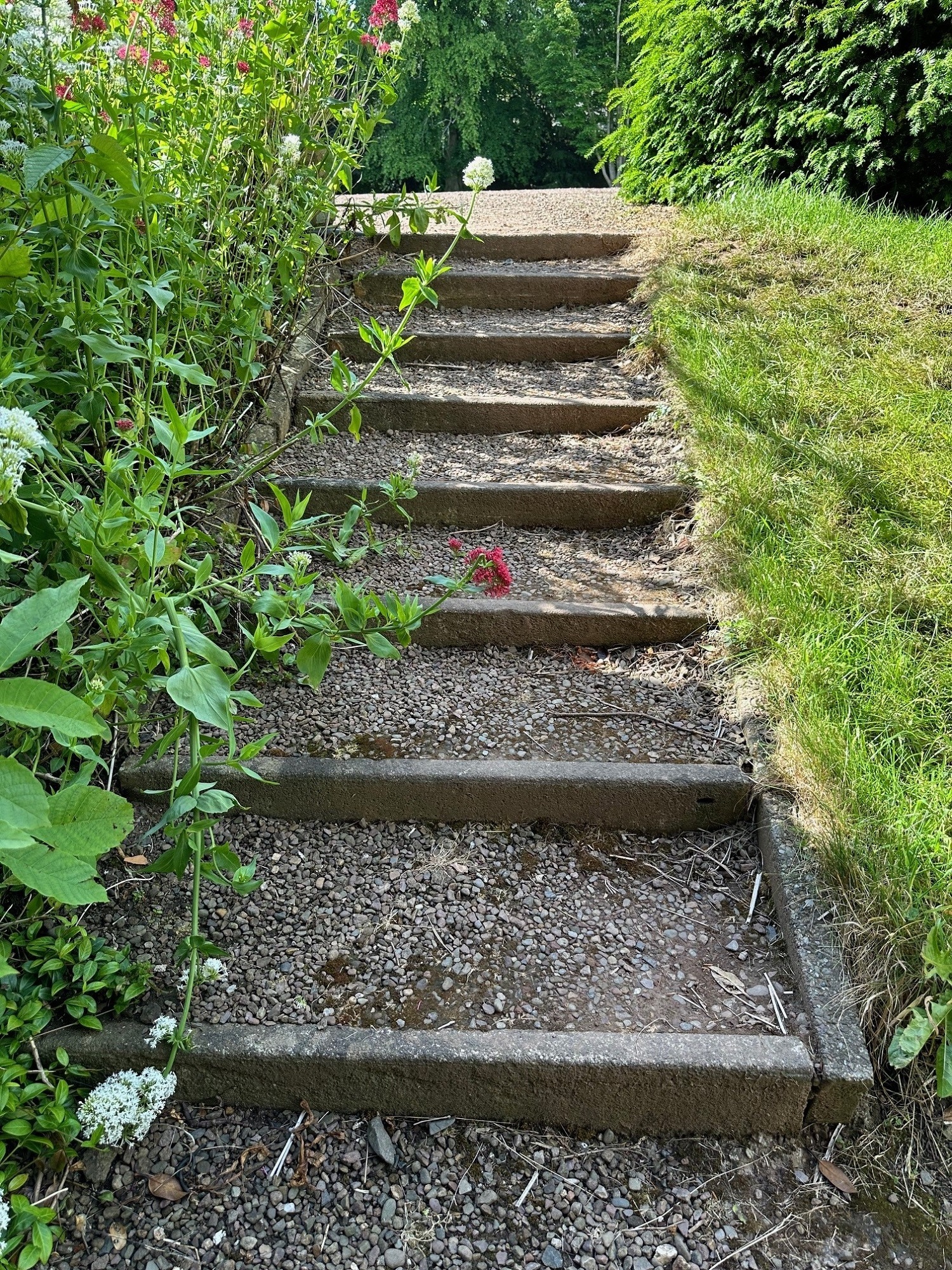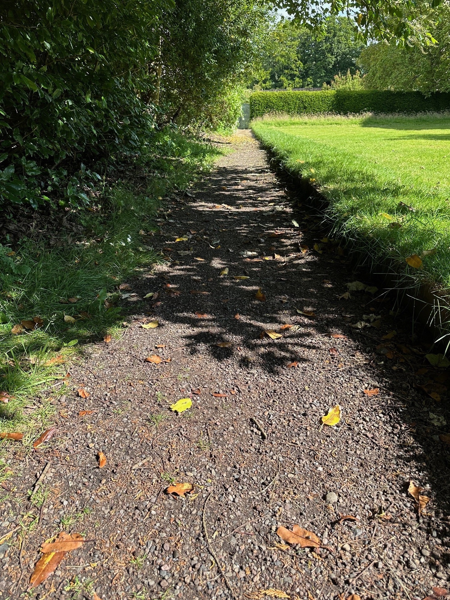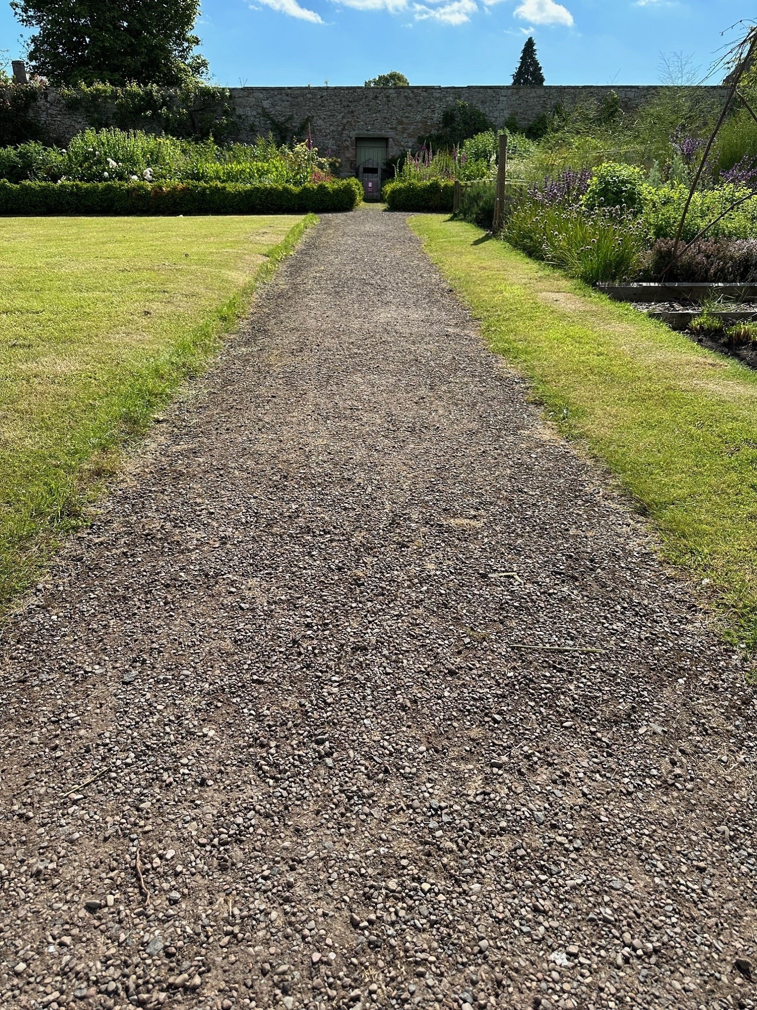 - It is surrounded by a path with a mix of a rhododendron border, established trees with the kitchen garden to the east, and the bulb and sunken lawn to the west.