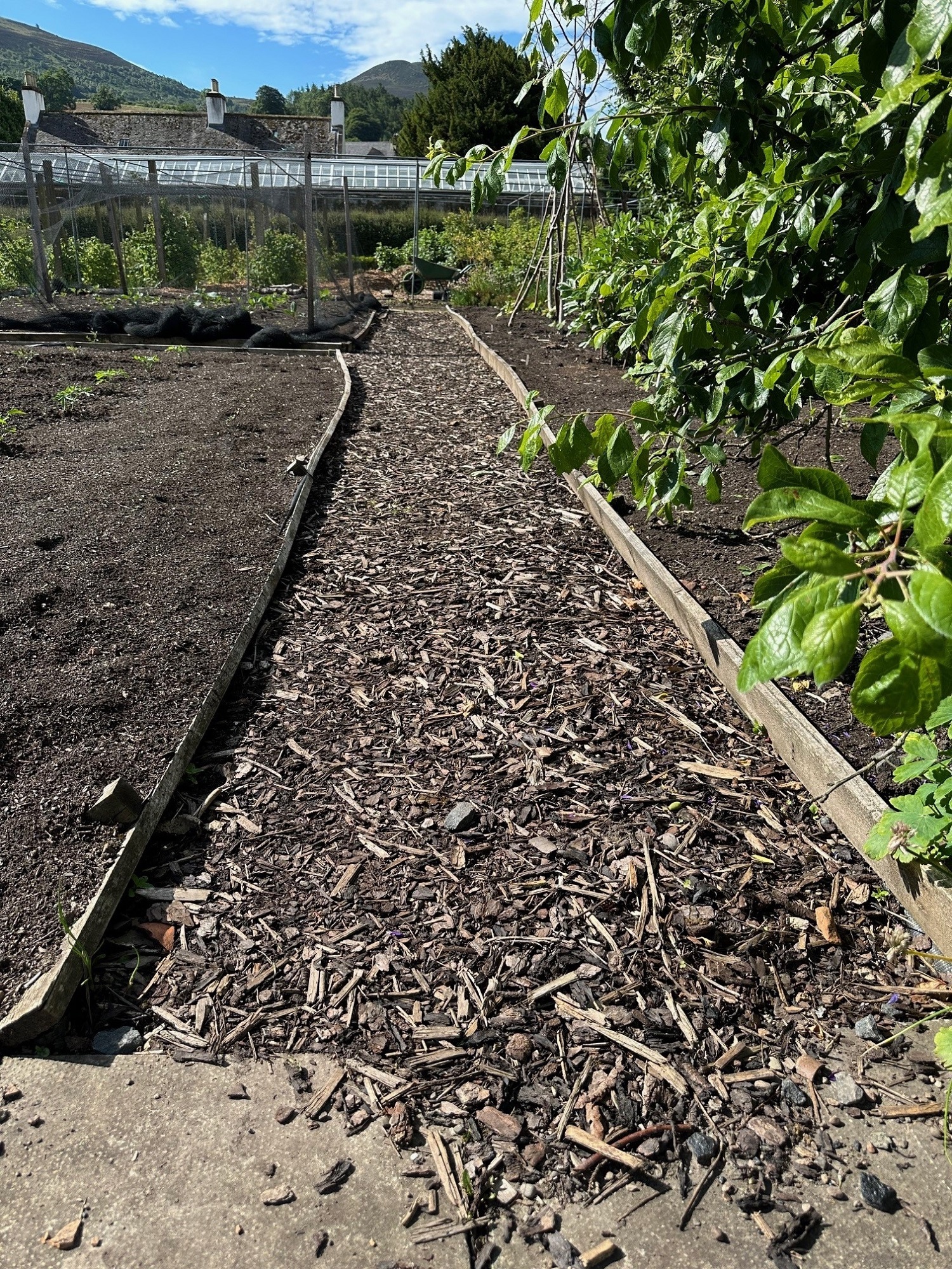 - This part of the garden contains vegetable beds and a fruit cage, with herbaceous borders surrounded by flat paths of gravel and wood chippings.