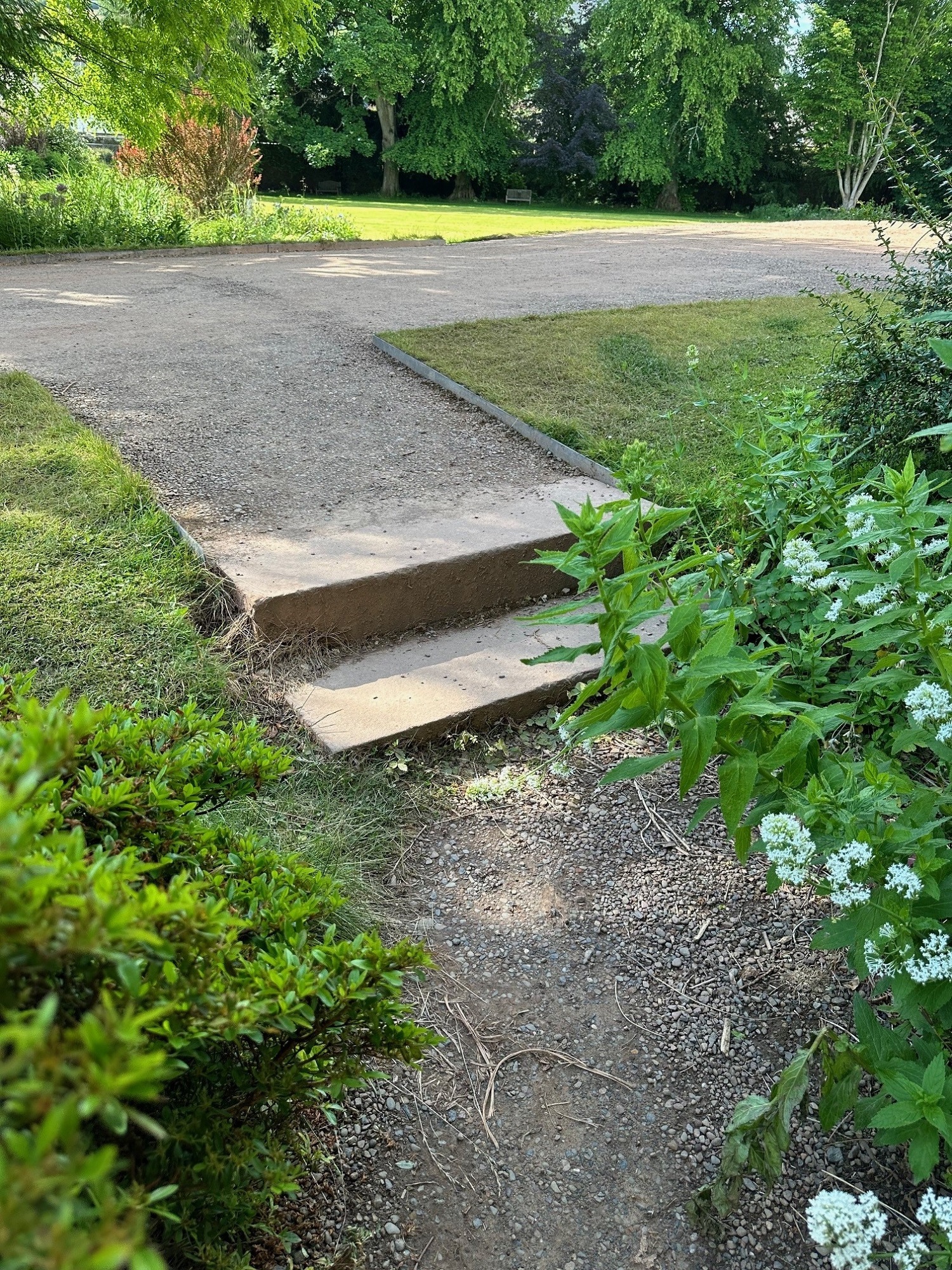- There are steps on the paths immediately to the left and right of Harmony House, with one path consisting of uneven paving slabs.