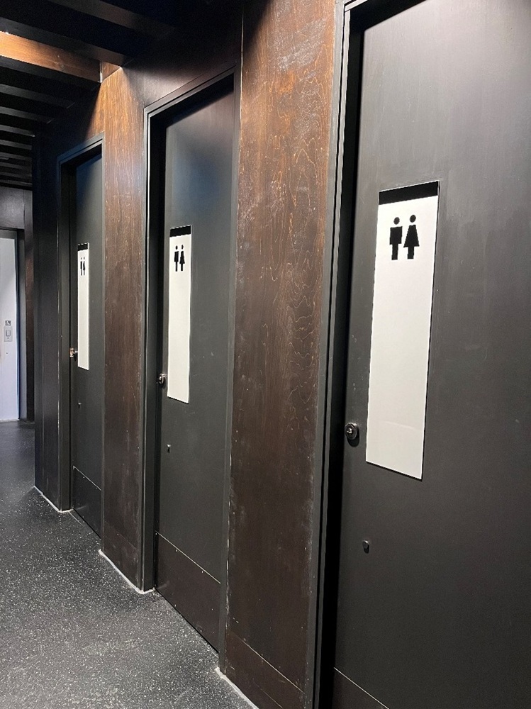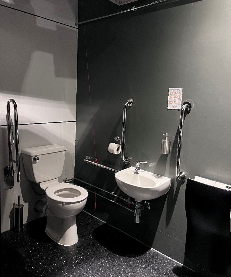 Toilets are located near the front door. There are 3 gender neutral toilets and one accessible toilet with baby changing facilities.