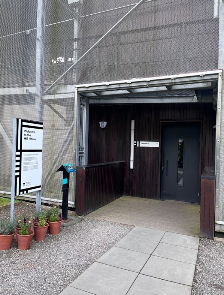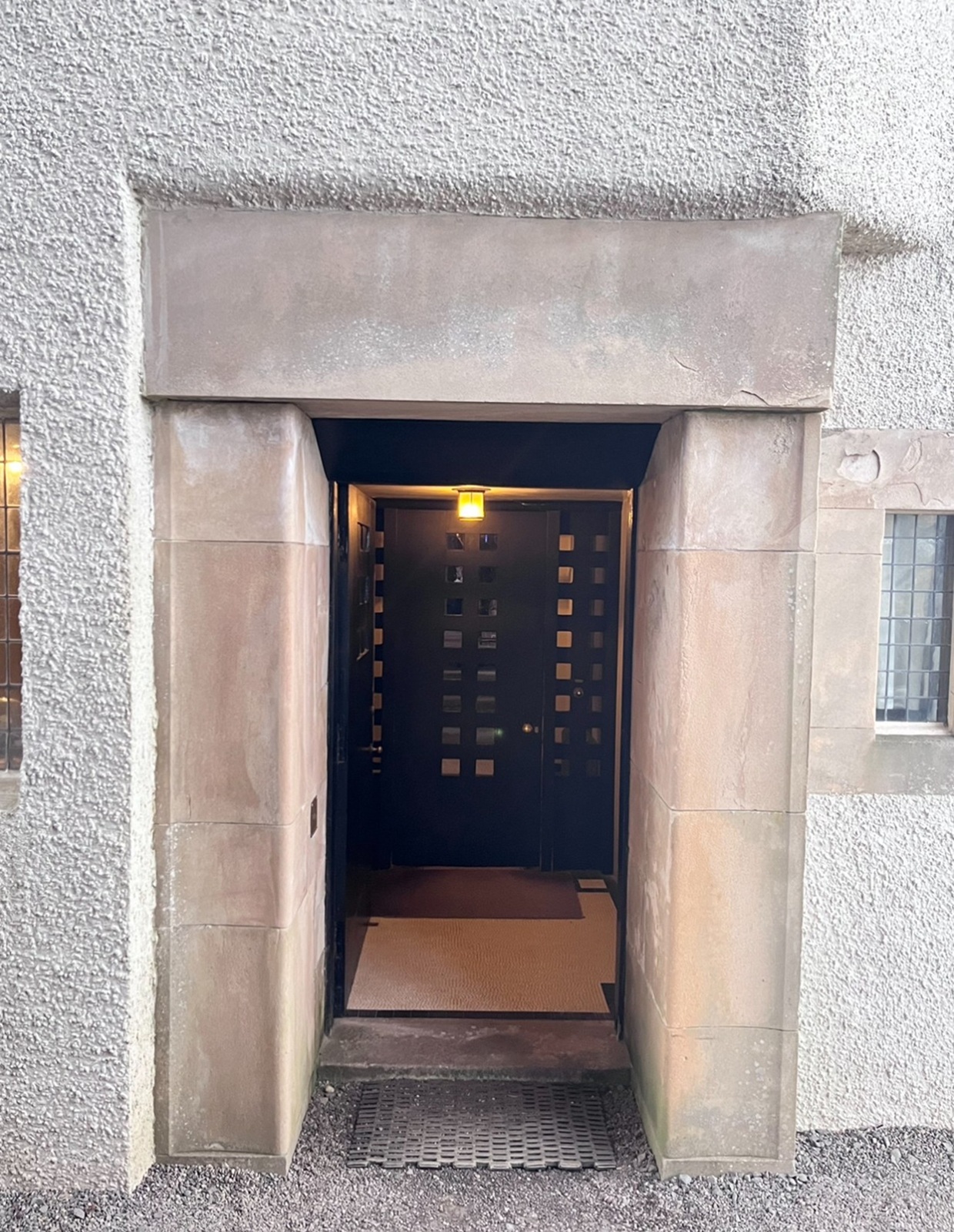 The main entrance to the Hill House is accessed via 4 wooden stairs, down onto the gravel path.