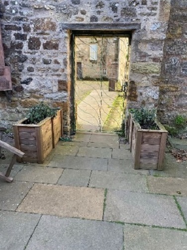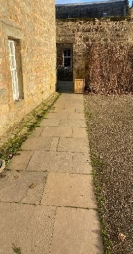 - The access door to the organic garden is 90cm wide and is down a paved path onto gravel.