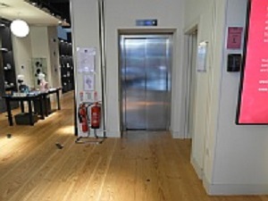 The building is over 5 floors (basement, ground, 1, 2 and 3) – a number of staircases run between these floors. There are also 2 lifts: the one by reception calls at all floors; the one at the back of the exhibition on the ground floor only goes to the second floor.