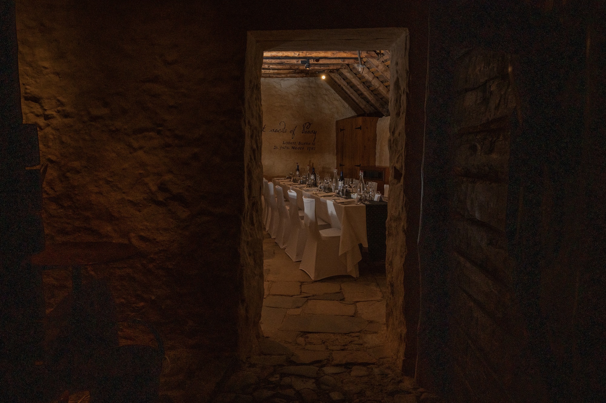 Burns an his faimily bidit haund fir nieve wi thaur fairm beasts. Ben the scullery, they ett thaur meals thigither, read by the sperk an lowe o the flames, courit roon the ingle-neuk, an gat thaur airliest scuilin. The scullery area is brocht tae life wi an eldritch rendeetion o Tam O Shanter, re-creatin the virr o the hoose whaur Burns’s eemagination furst tak lowe.