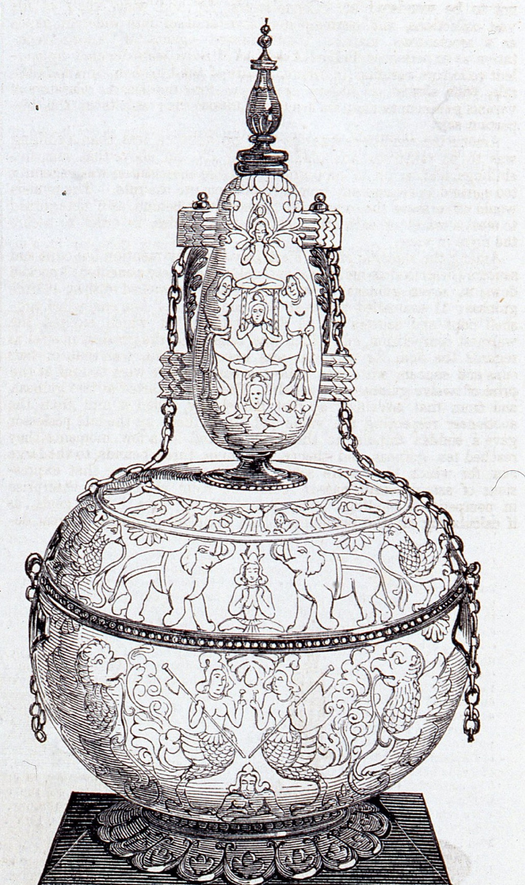 A later description refers to the vase as a ‘gilt metal-mounted hookah.’ However, the base does not seem to open and, although the shape might remind one of a hookah, it has no openings or attributes that would suggest that was its function. This description does mention the object’s origin in more detail – based on the carvings, it states that it is a 17th-century Sinhalese object. The Sinhalese people are native to the island of Sri Lanka. In the 17th century, when this object was made, the island was ruled by the Kingdom of Kandy.