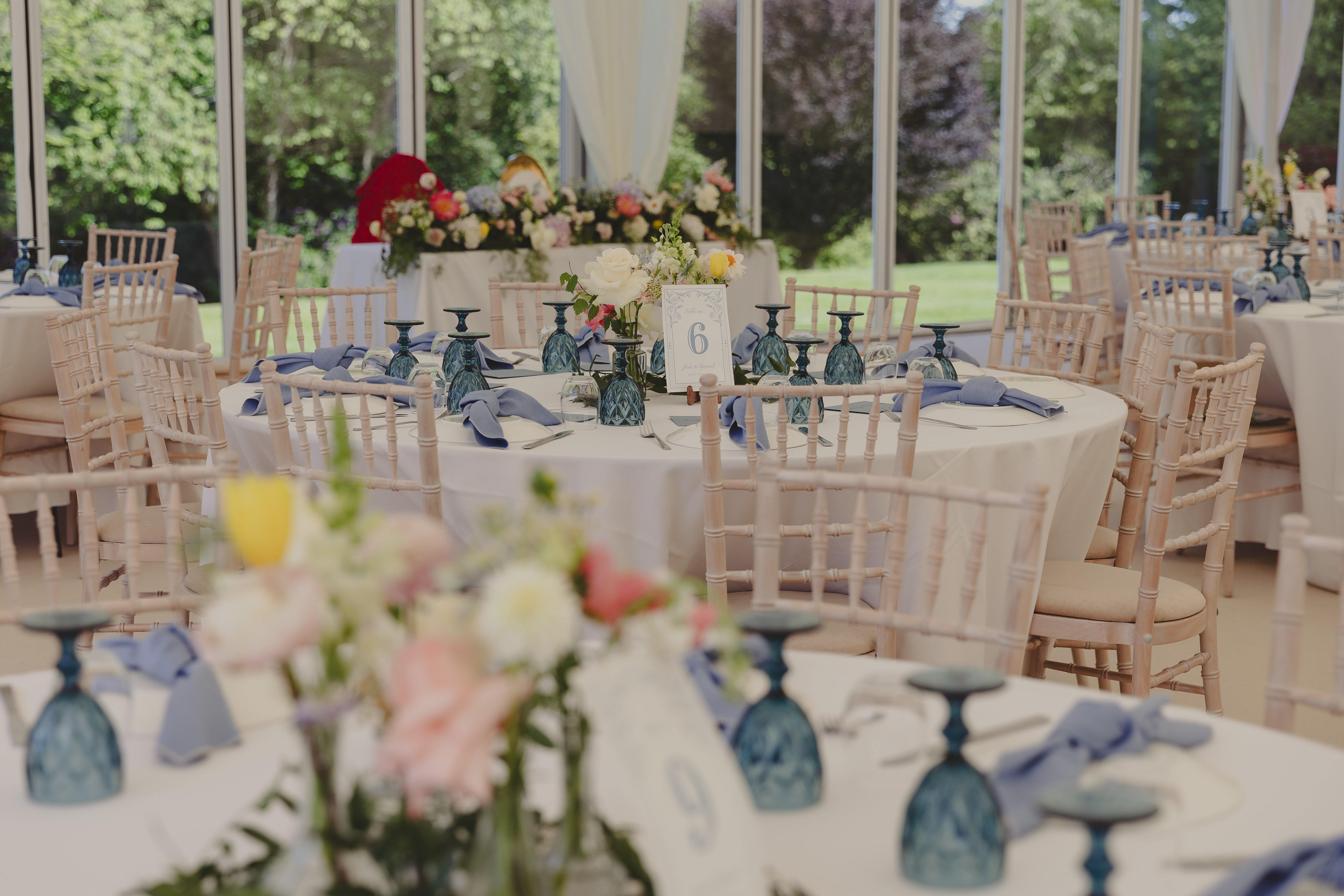 Their décor combined vintage elegance with Jaipur-inspired touches. The marquee was draped in creamy fabric, featuring blue and white table settings, styled beautifully by Alan Ritchie Exhibition & Design, Virginia’s Vintage Hire, and StyleinDetail.