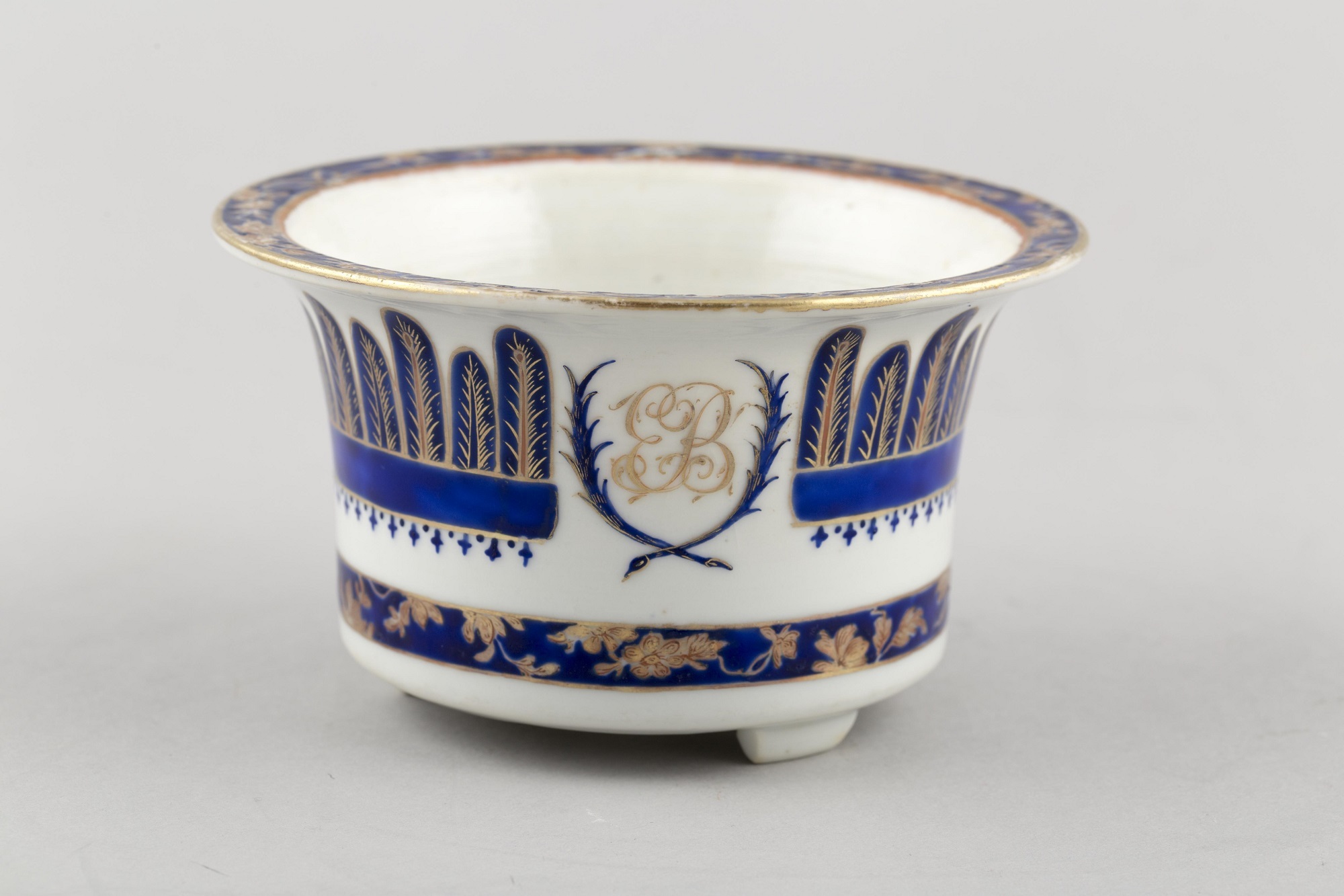 Also at Brodie Castle is a rare set of Chinese porcelain flower pots, painted in blue and gold with the cipher ‘EB’, dating from 1795–1805. The cipher belongs to the wife of Alexander Brodie, Elisabeth, née Wemyss (1748–1800), a niece of the 6th Earl of Wemyss. Their daughter, also Elizabeth (1794–1864), married the last (5th) Duke of Gordon. Upon her death, her family heirlooms were sent to Brodie Castle, which is probably how the three armorial services and the flower pots arrived at the castle, presumably all ordered by her father.