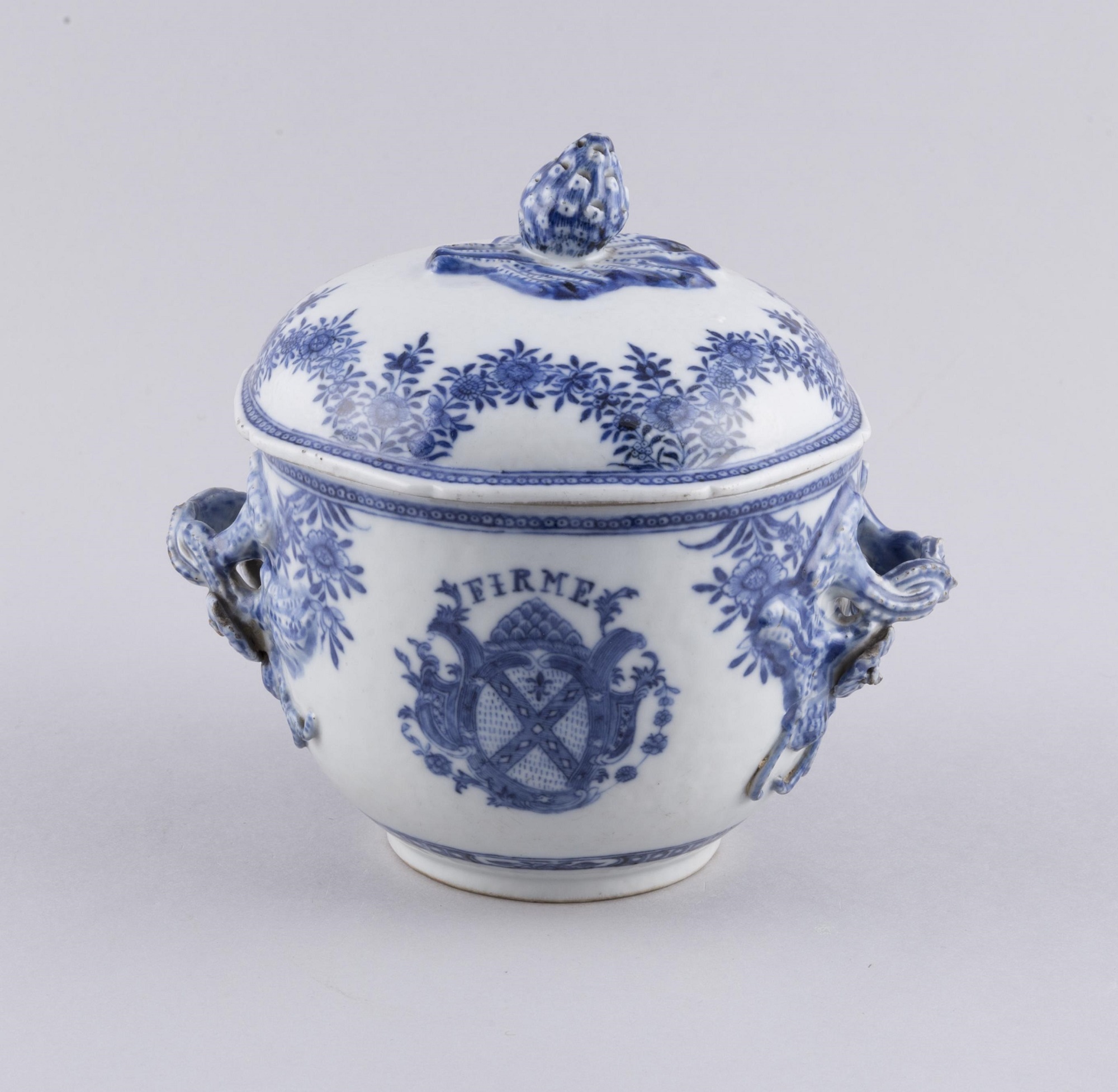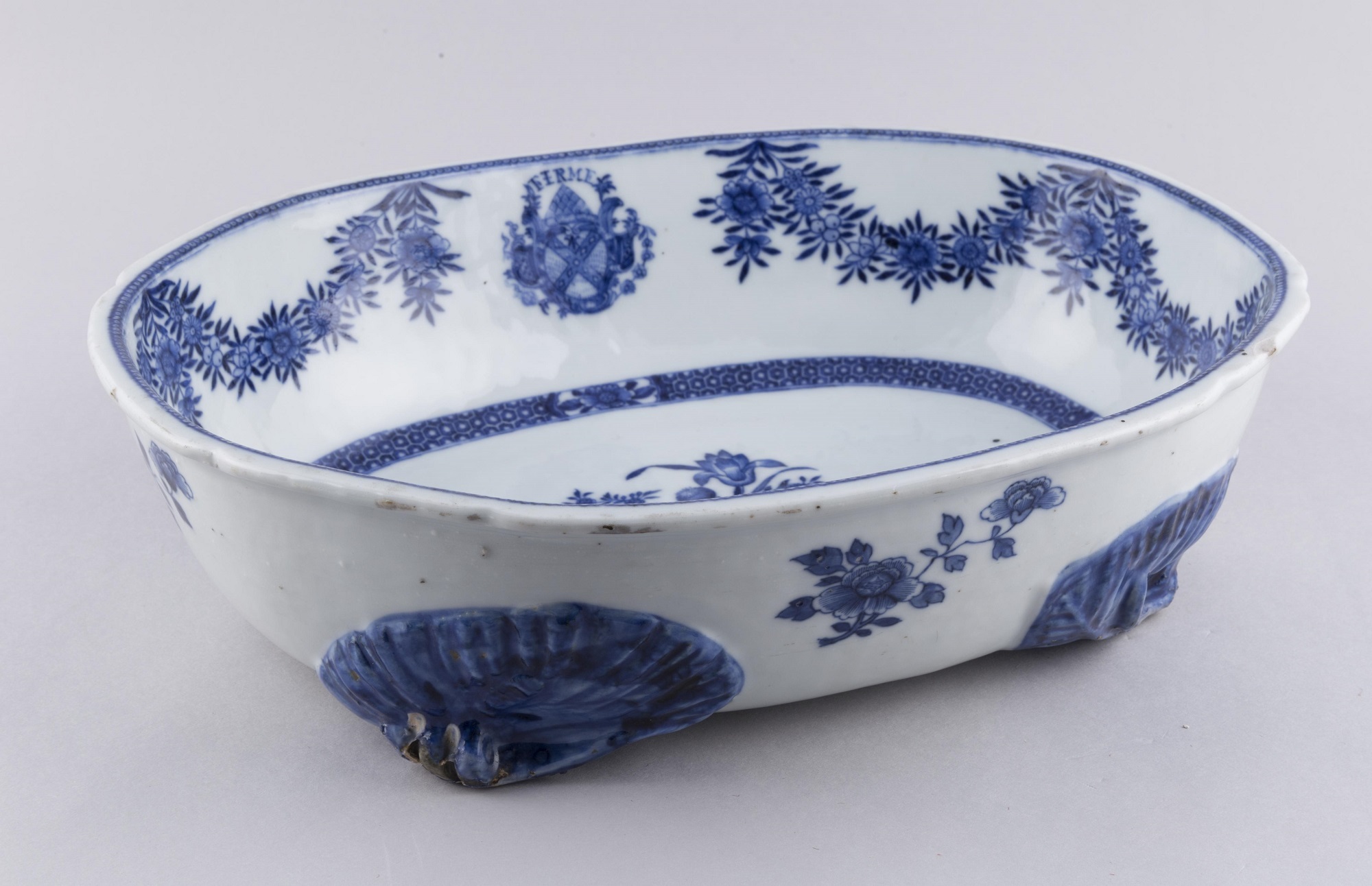 At Newhailes House, a Palladian country house near Edinburgh, there is a partial 17-piece armorial table service with the arms of Dalrymple of Hailes, made around 1775. The coat of arms and pattern is painted entirely under the glaze in cobalt blue. This economical decoration required just one firing and was often ordered as everyday tableware. Several of the shapes are associated with the Swedish market.