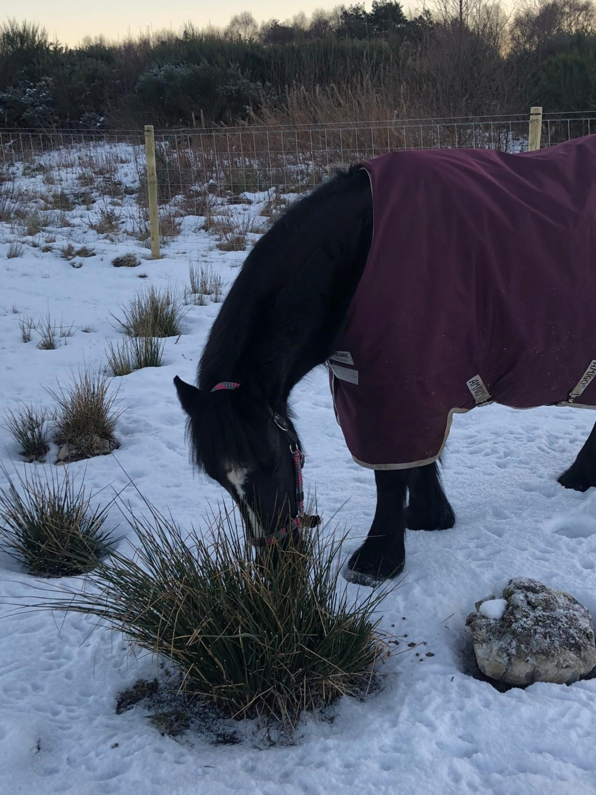 The estate team includes our two Highland cattle, Vanilla and Primrose, and award-winning Shetland cattle – they are the real grafters, munching the scrub on the moor. We also have two horses in the team – Rosie and Glen. This year they’re going to be taking a more active role on the battlefield. The long-term plan is to use our younger bay mare Rosie to pull the brush of the moor and for Glen to enjoy his retirement conservation grazing. Rosie and Glen came to us from busy lives at another of our places – Mar Lodge Estate.