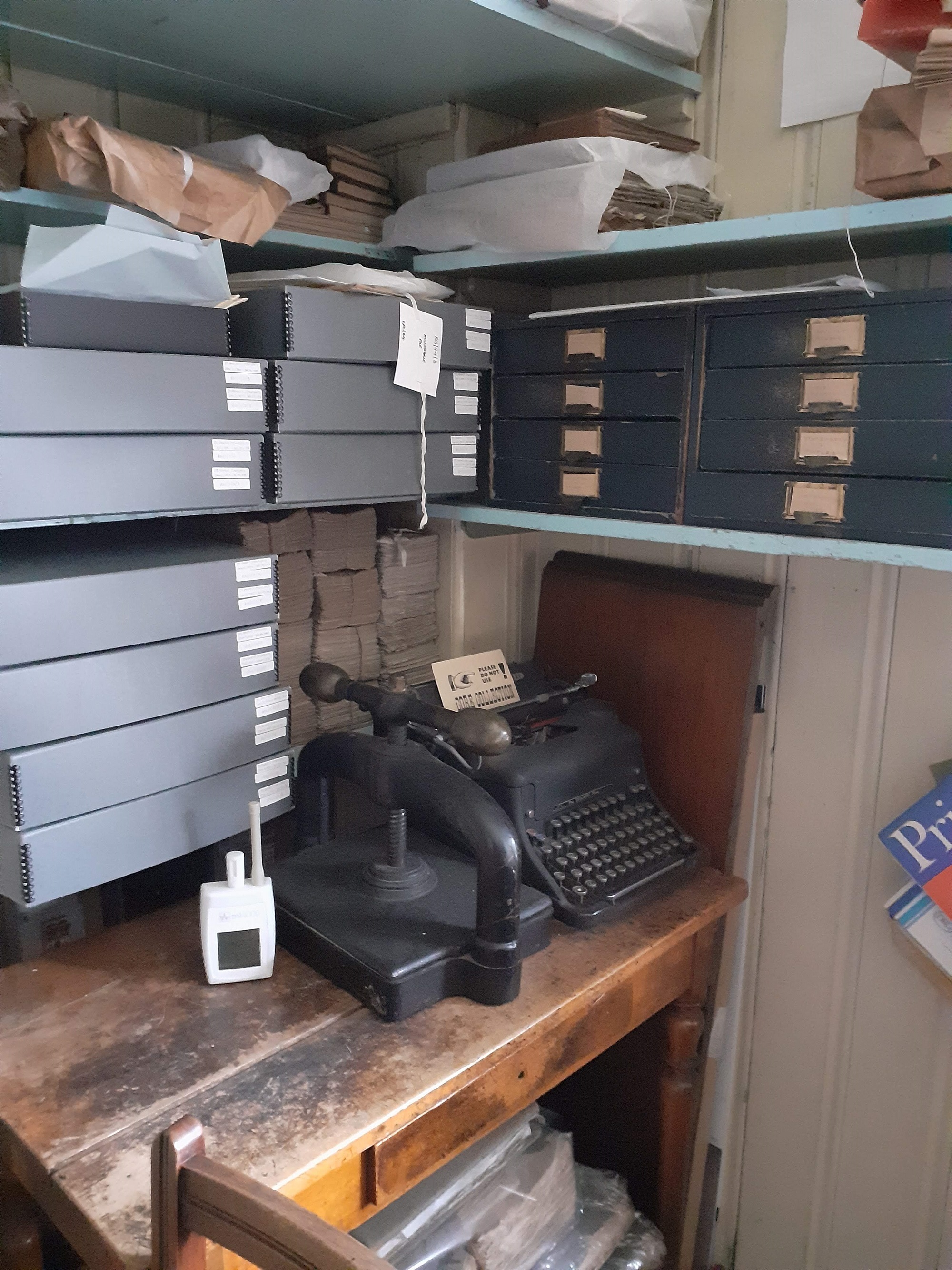 Many materials, both modern and historical, are sensitive to light exposure, which causes fading, discolouration and embrittlement over time. Heritage objects do suffer from light damage, but properties often control this as much as possible by maintaining lower light levels in rooms. At Smail’s, the staff need to work with bright task lighting when operating the machines and setting type. Although this may not affect the metal machines, the more sensitive paper items are at greater risk.