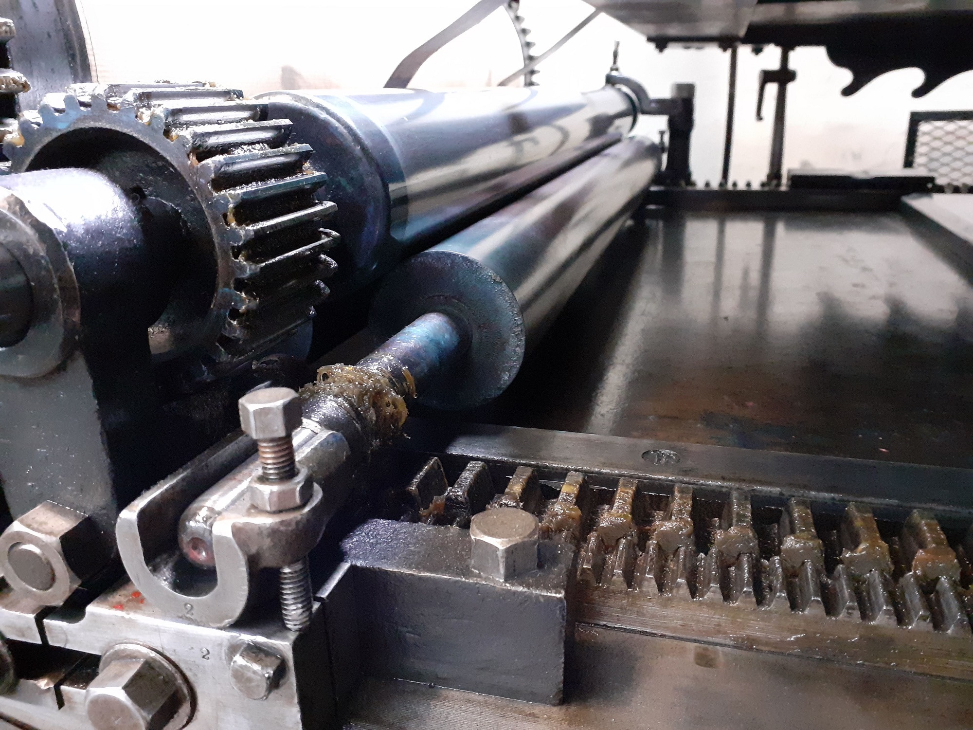As with any modern machinery, the printing presses require regular maintenance. They are robust objects, but they have parts that will wear naturally with use. Eventually, some parts will need replacing, meaning that something will need to be sacrificed: either the original object in its physical entirety, or the experience of it working. This is why we monitor and record any changes we make to the machines. At Robert Smail’s we rely heavily on the knowledge and experience of the skilled printers, whose understanding of the sound and feel of the presses allows them to make adjustments and repairs.