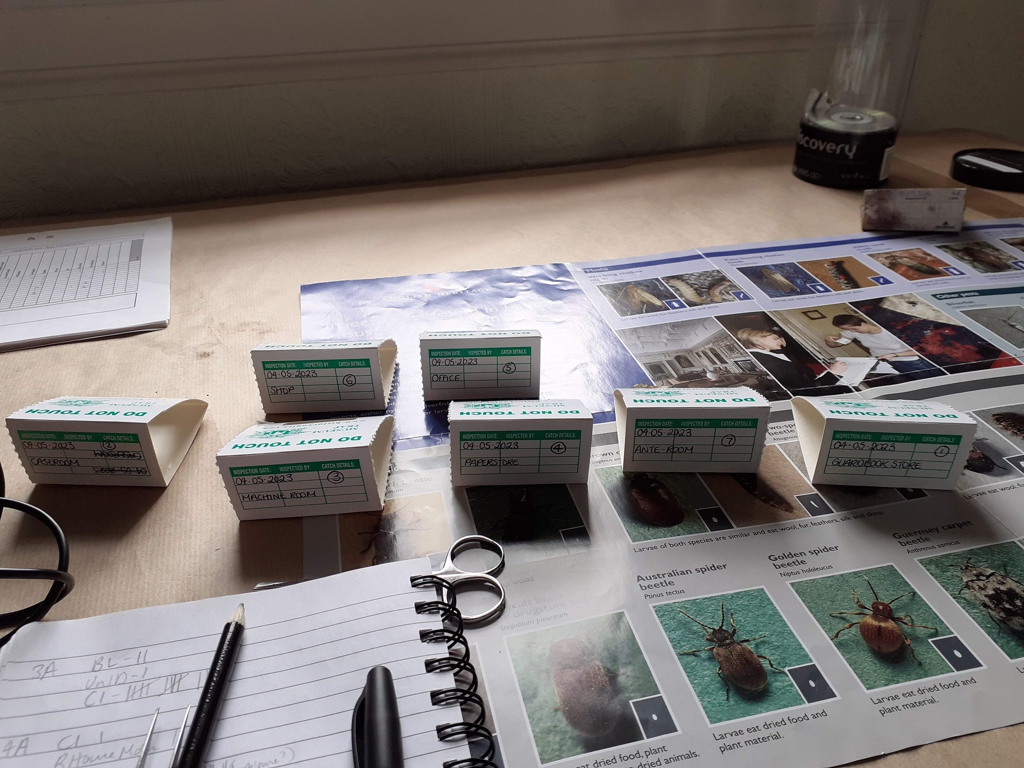 Alice has taken on the IPM (Integrated Pest Management) programme, which doesn’t look specifically to catch pests but rather gives us an idea of what insects of concern might be present at the property through findings on blunder traps placed strategically in rooms. This is particularly important as, although much of the collection in the property is metal, there is also a huge amount of organic material such as paper and archives in the collection, some of which dates back to the shop’s beginnings in the 1860s. Paper materials are particularly vulnerable to damage from several notable kinds of pests, including (the aptly named) booklouse and silverfish. Monitoring pest activity is the best way to understand what threats these seemingly innocuous insects can do to collections if left unchecked.
