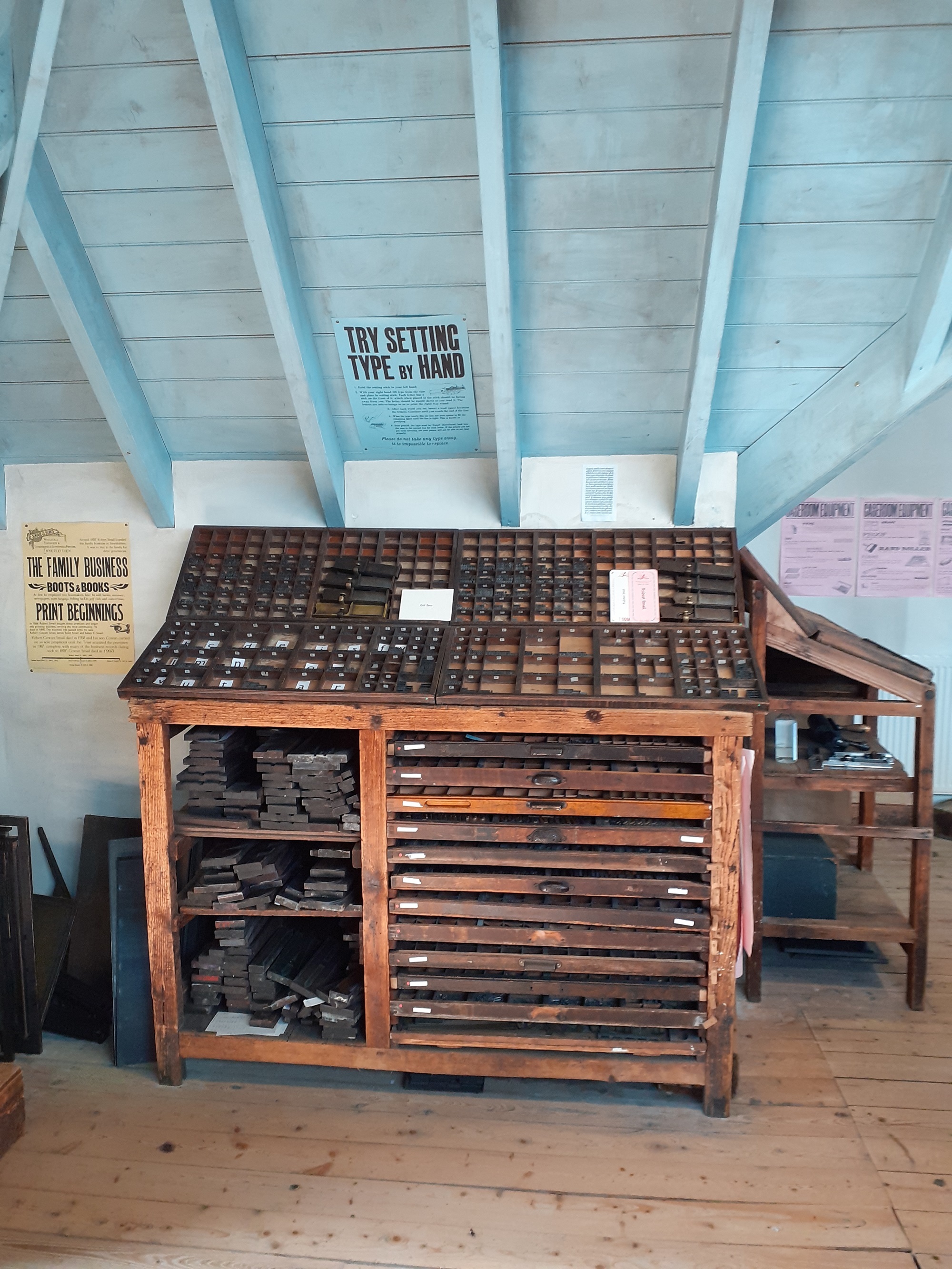 At Smail’s, there is still the same Trust-wide focus in protecting working collections from light damage and pests of concern, and how fluctuating or unsuitable environments, such as temperatures, humidity, dust and pollutants, can all contribute to material embrittlement, which can ultimately impede functionality. We’ve been able to build on previous Trust conservators’ endeavours, especially against pest outbreaks, notably woodworm in the wooden drawers that the typeset is housed in. We’ve been using a legacy of environmental data and reporting to understand the property’s unique preservation needs for the building, interior and mixed media collections.