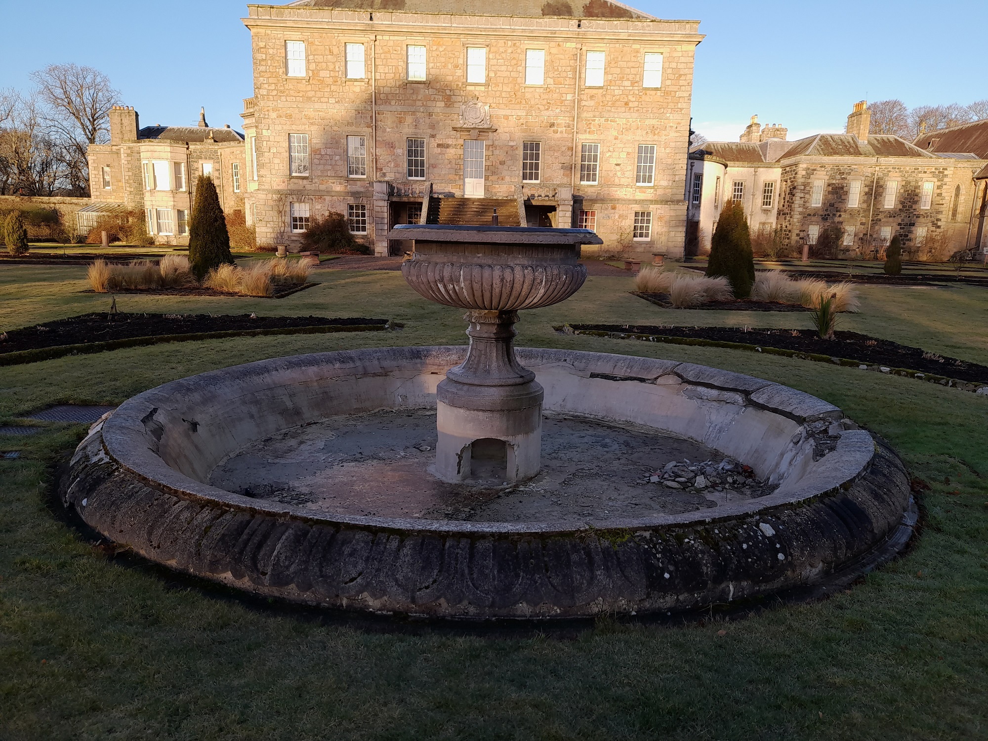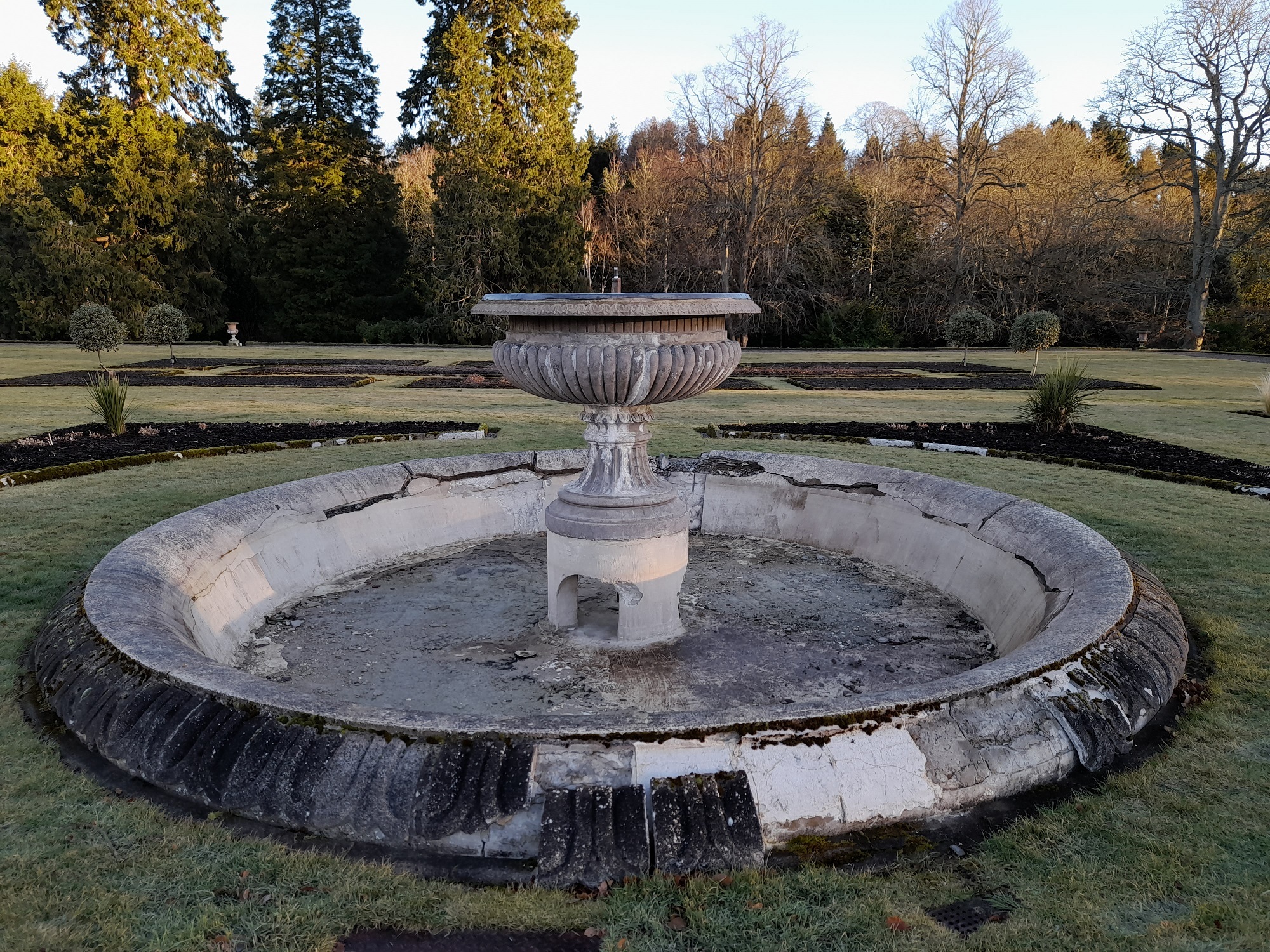 The fountain was made using an early form of concrete, which requires regular repair work in order to keep it operational. Despite this ongoing maintenance, the concrete structure has now started to fail and a larger-scale conservation project is required. There are also some concerns about the stability of the fountain base as it is placed on artificial ground – the terrace had been built up by the 4th Earl of Aberdeen in the mid-19th century as part of his improvements to the house, gardens and estate.