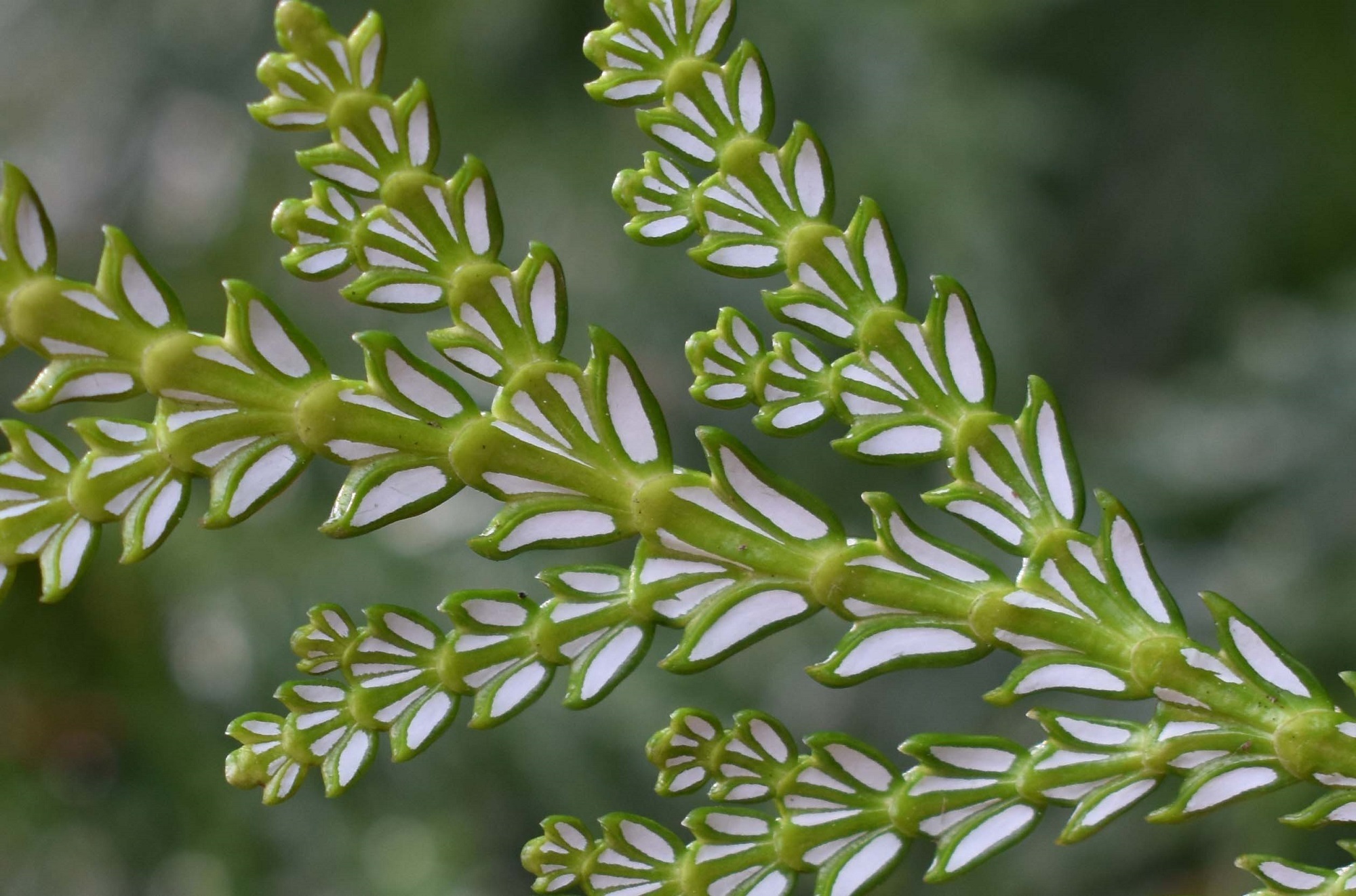 Behind these trees is another Japanese conifer (Thujopsis dolabrata), which is easily identified by its thick scaly leaves which have splashes of white stomata underneath. This tree is inclined to grow with several stems. We have no champion Thujopsis at Crathes but I like it because of the amazing white and green patterns on the underside of the leaf, which are only noticeable if you think to look.