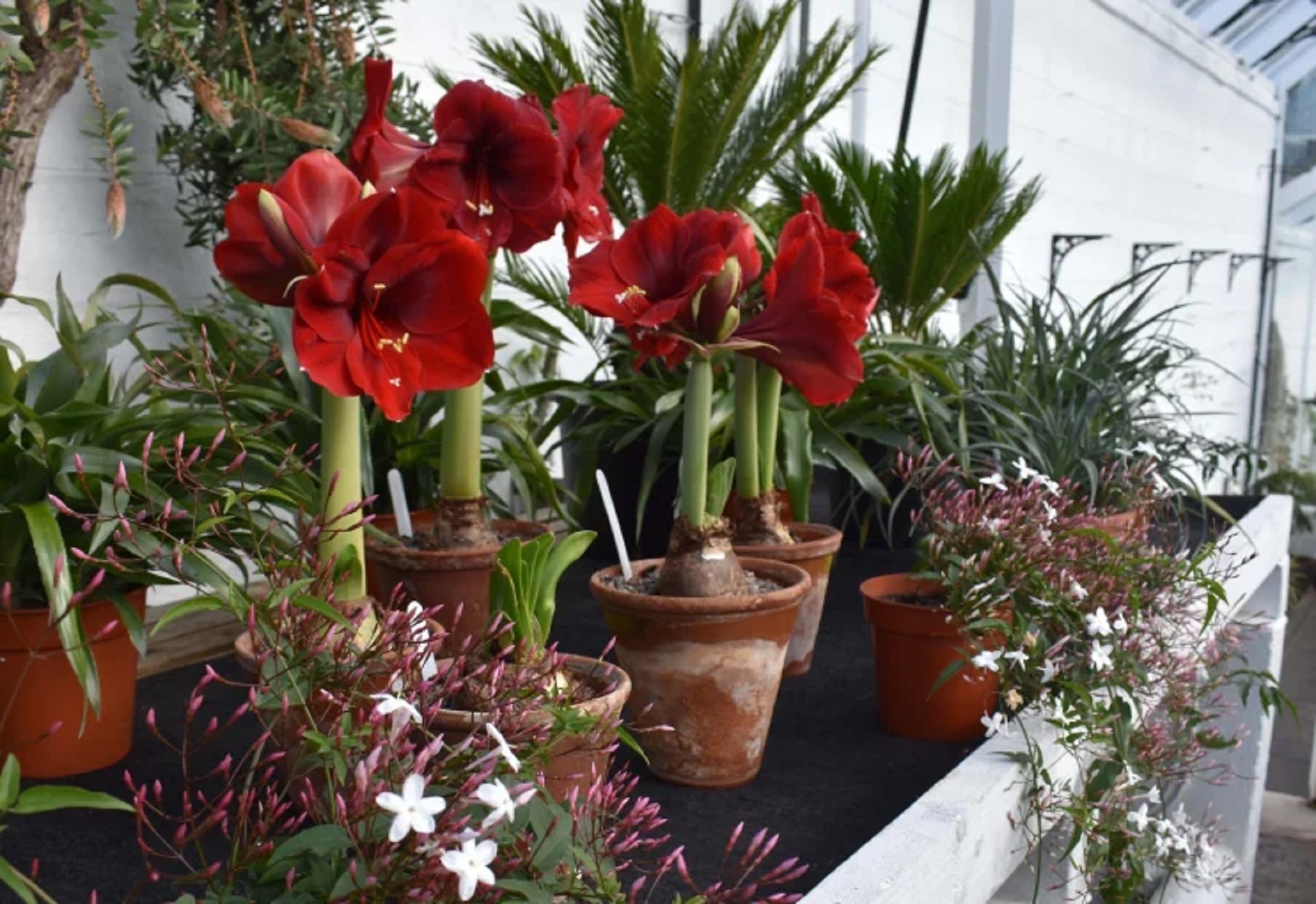 - The white display in the second glasshouse has been removed and the house cleaned. Hippeastrum ‘Magnum’ is now a star. Joanna and Emily had the scary job of removing the bulbs from the old ice house (it is full of water below, with cave spiders and their dangling nests above). Presently the bulbs are in the broadspan, but soon will be displayed in the show houses.