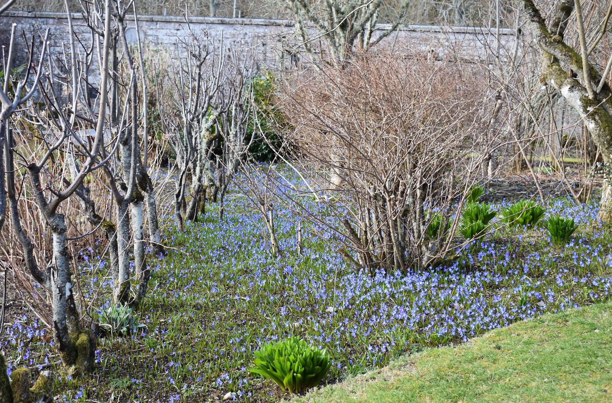Spring was definitely confirmed in the walled garden where the chilling winds are kept at bay by the walls and surrounding trees: the Chionodoxa was spreading its magic throughout the garden; the Stachyurus praecox on the Aviary Terrace was dripping with flowers; the Pieris japonica ‘Rosalinda’ on the South Border was buzzing with bees; and the Cornus mas on the Yew Border was a picture.