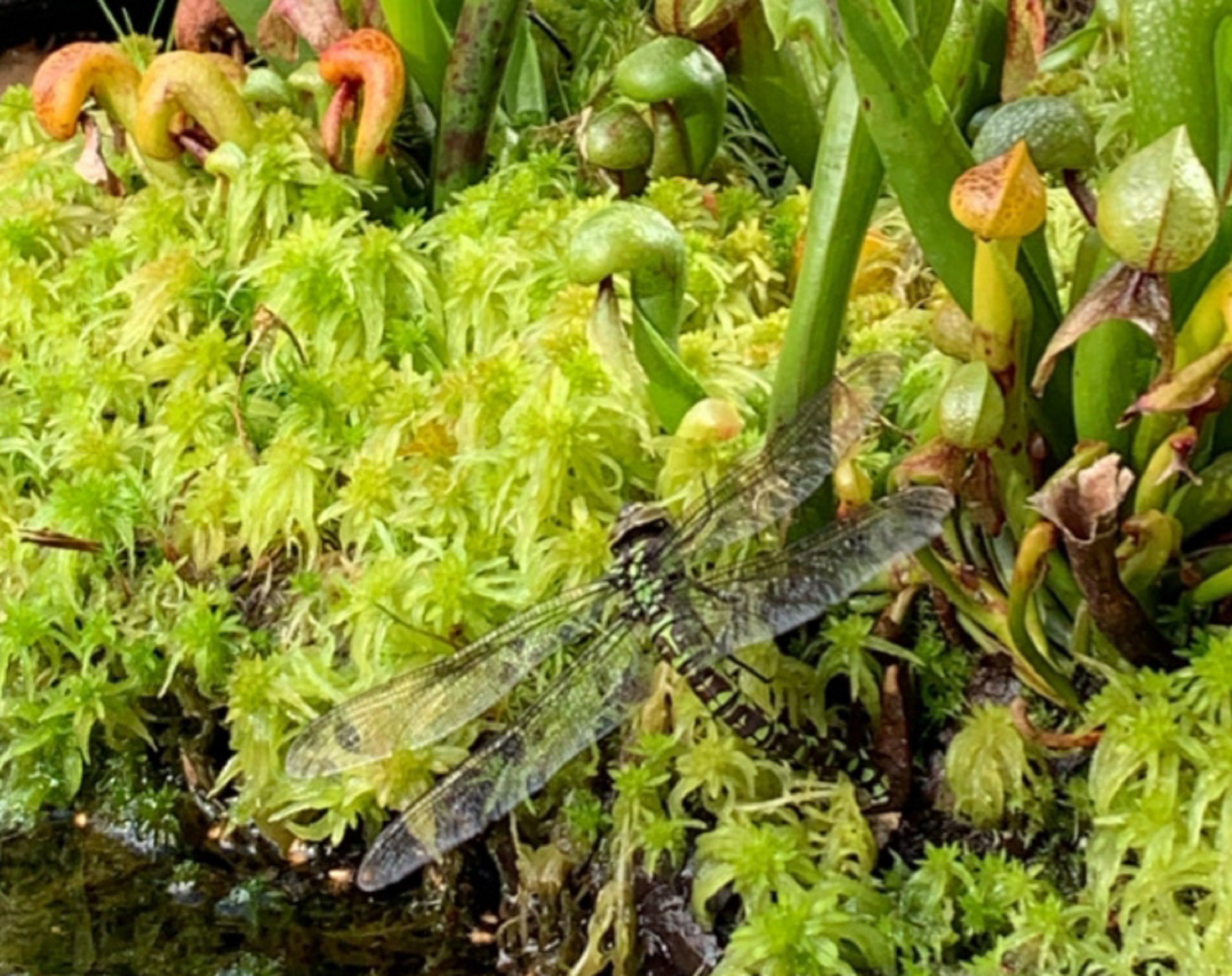 - The gardeners were thrilled to watch a large dragonfly laying eggs in the moss lining the edge of the dipping pool. Ironically, it has laid its eggs where the American carnivorous plants thrive; maybe it’s too big to succumb to the pitcher traps, or maybe the sweet-scented trap doesn’t appeal to this carnivore that likes to take its prey on the wing. Emily got a wonderful photograph.