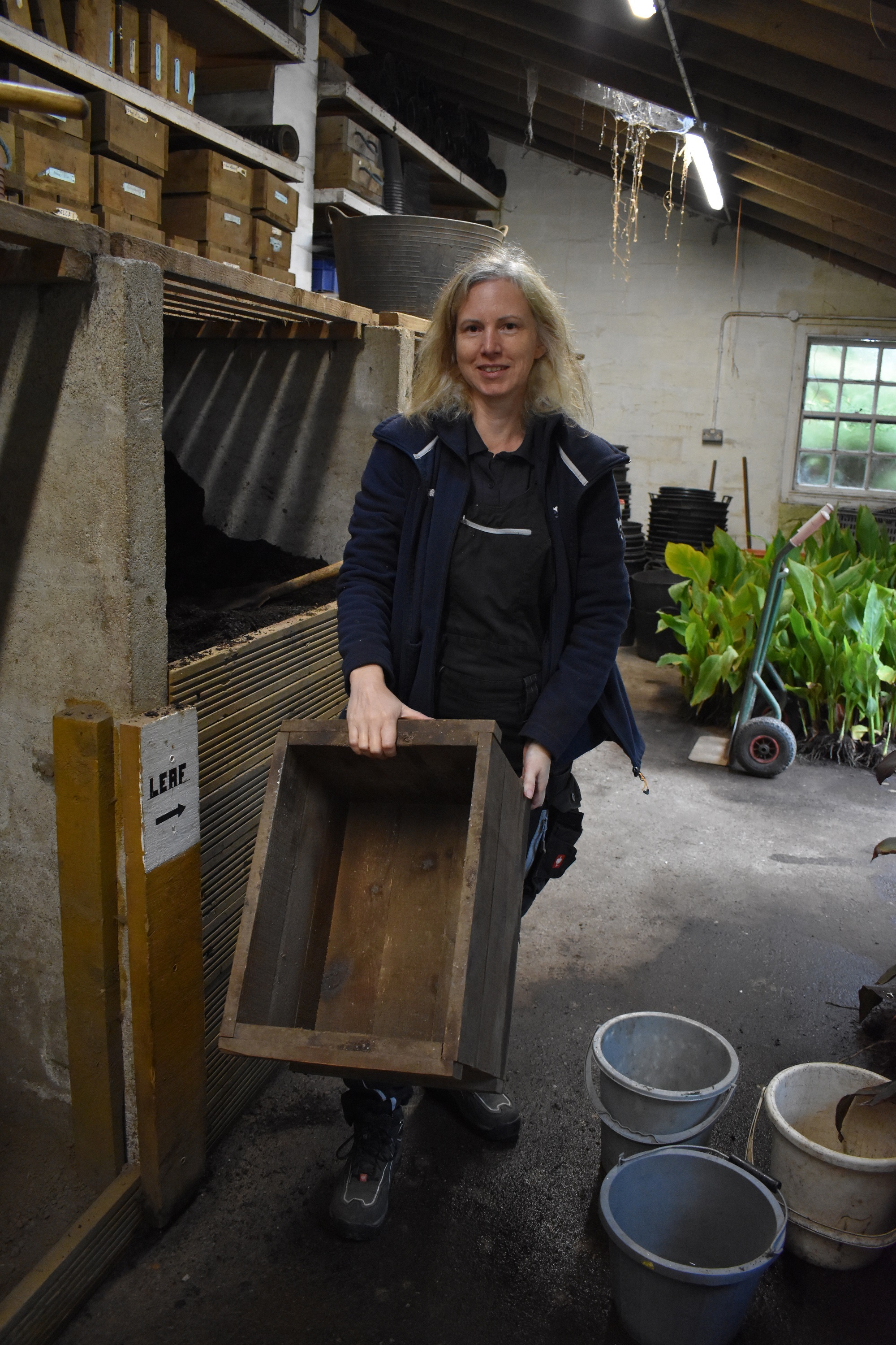 Mixing is done the hard way on the soil house floor, shovelling the various ingredients together until evenly distributed. Recipe quantities are measured in bushels (8 gallons or 36.4 litres), for which Joanna has a ‘bushel box’. The cutting compost is mixed in small quantities as needed and is based on a John Innes recipe: two bushel of leaf, one bushel each of loam and sand. The leaf mould replaces peat, which has not been used in the garden since 2001.