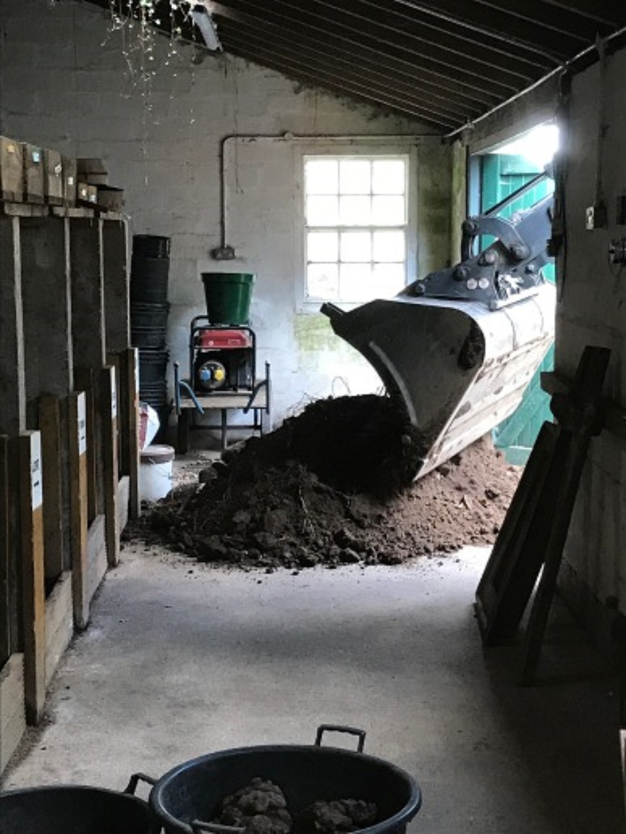The garden gate project – the Welcome Building – is well underway. This project has been talked about for many years. The building will offer interpretation and will provide an entrance point to the garden. I wondered about the sustainability of this project. James (head gardener), Mike (gardener) and Emily (apprentice) spent a very wet Monday lifting the slabs at the gate so that the local contractors could come in to prepare the foundations. An archaeologist carried out a watching brief, but found nothing. To avoid the excessive use of concrete, with its high carbon footprint, the building is to be suspended on oak legs that are secured onto concrete pads. A local contractor carried out much of this work. Unfortunately, the granite bedrock turned out to be just under the surface of the area, and drilling through the hard rock took longer than anticipated.