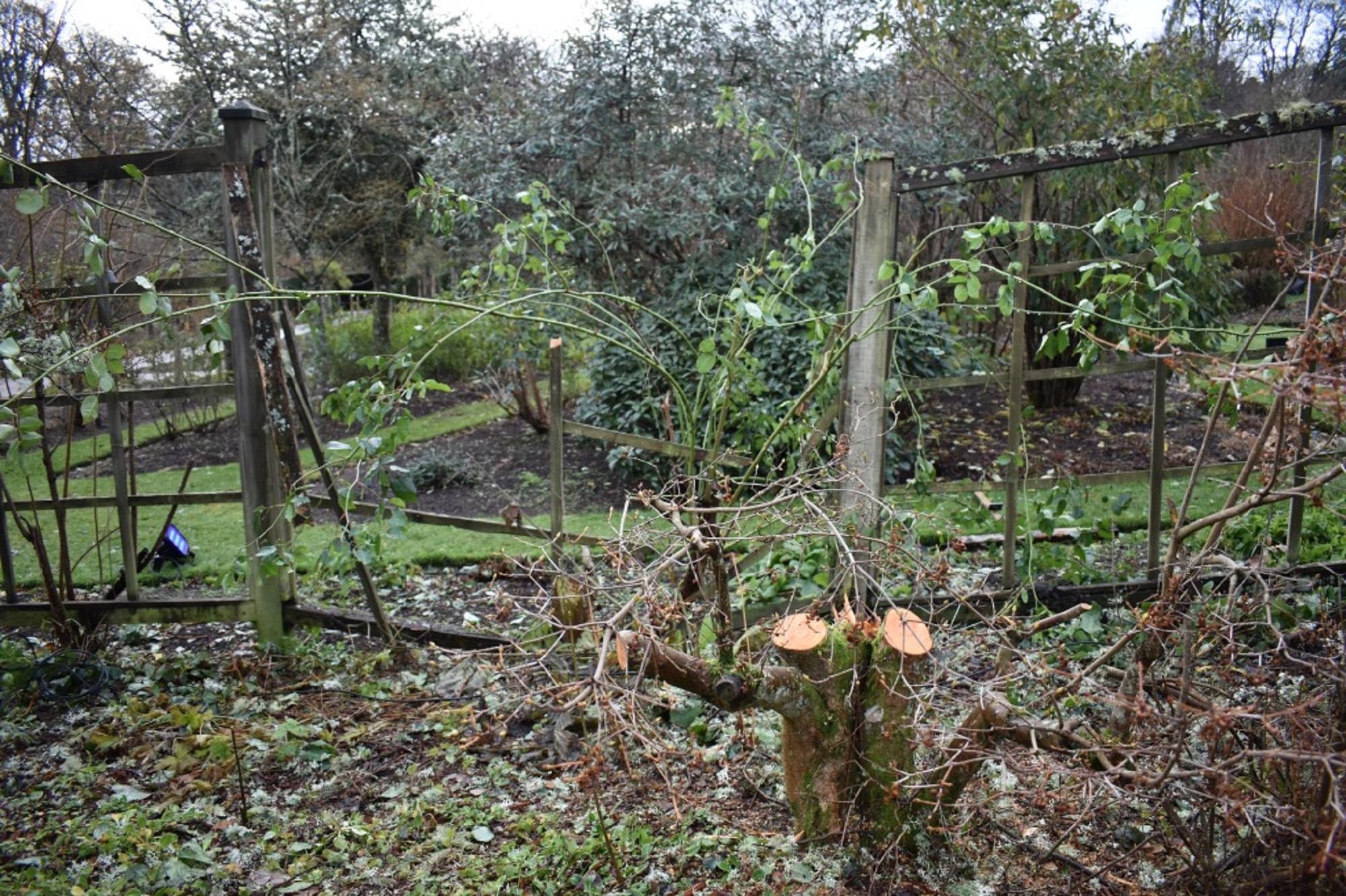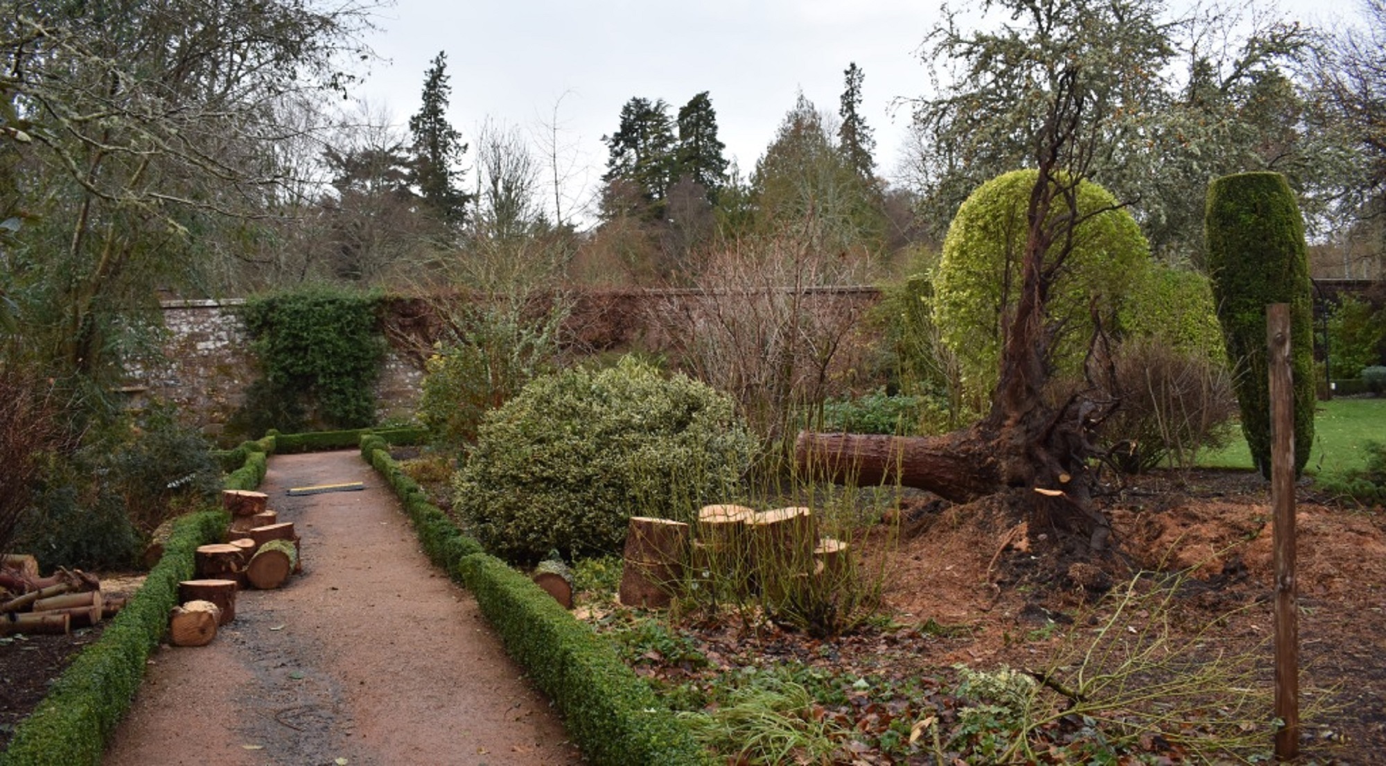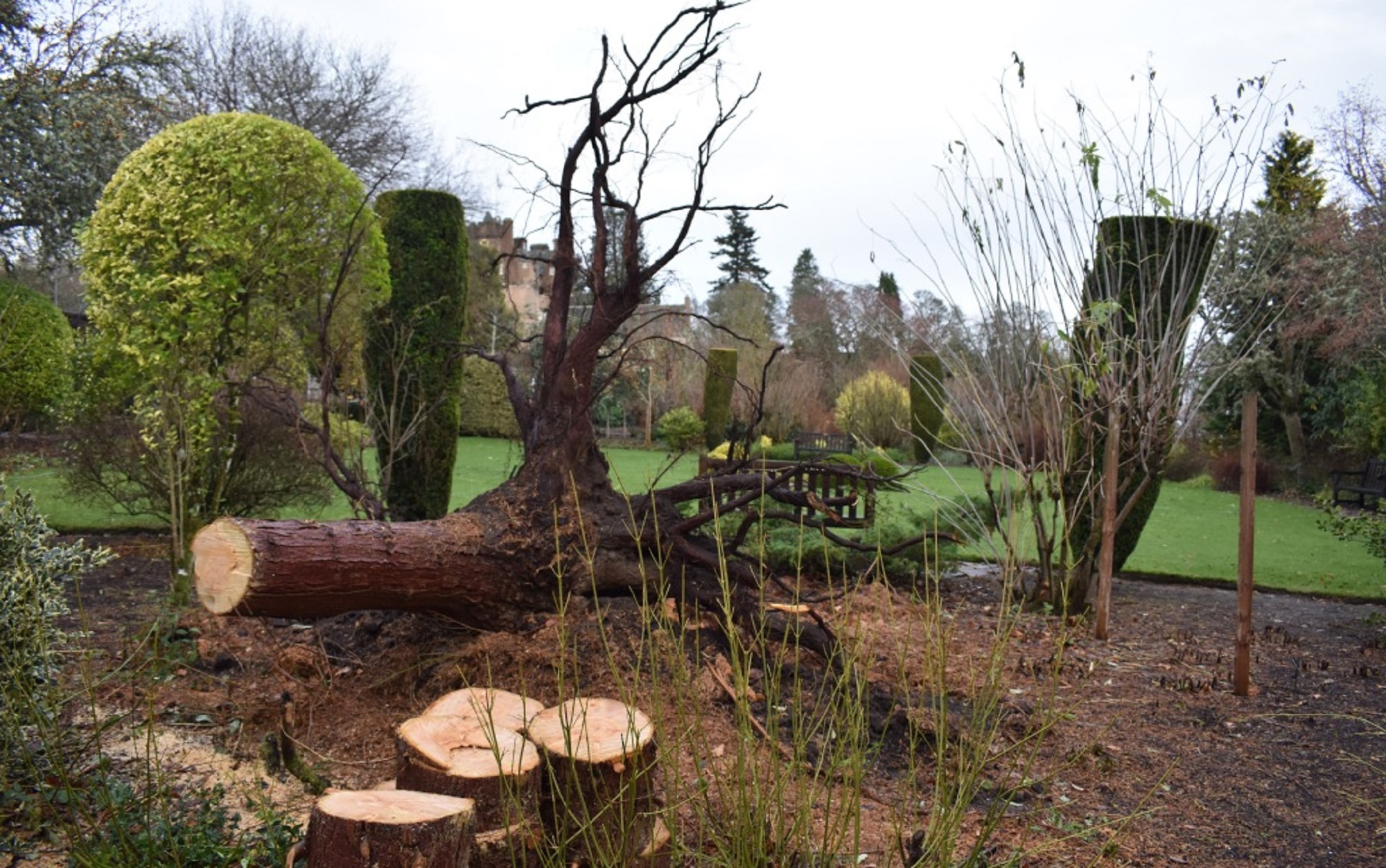 With the estate closed, it was over a week after the gale before I managed to see the damage at Crathes. James tells me they had power loss over four days, with intermittent relief, and some water problems. I had heard from Joanna that the glasshouses were not damaged and that the standby generator behaved well. That the arbutus tree (Arbutus menziesii) had fallen surprised no-one; it was due to be removed in the near future. Fortunately, its daughter, only a few yards away, is thriving and so the fieldfares, blackbirds and bullfinches will not have to forgo all the fruity feasts. I wrote about the history of this tree early last year in my What’s in a name? blog post.