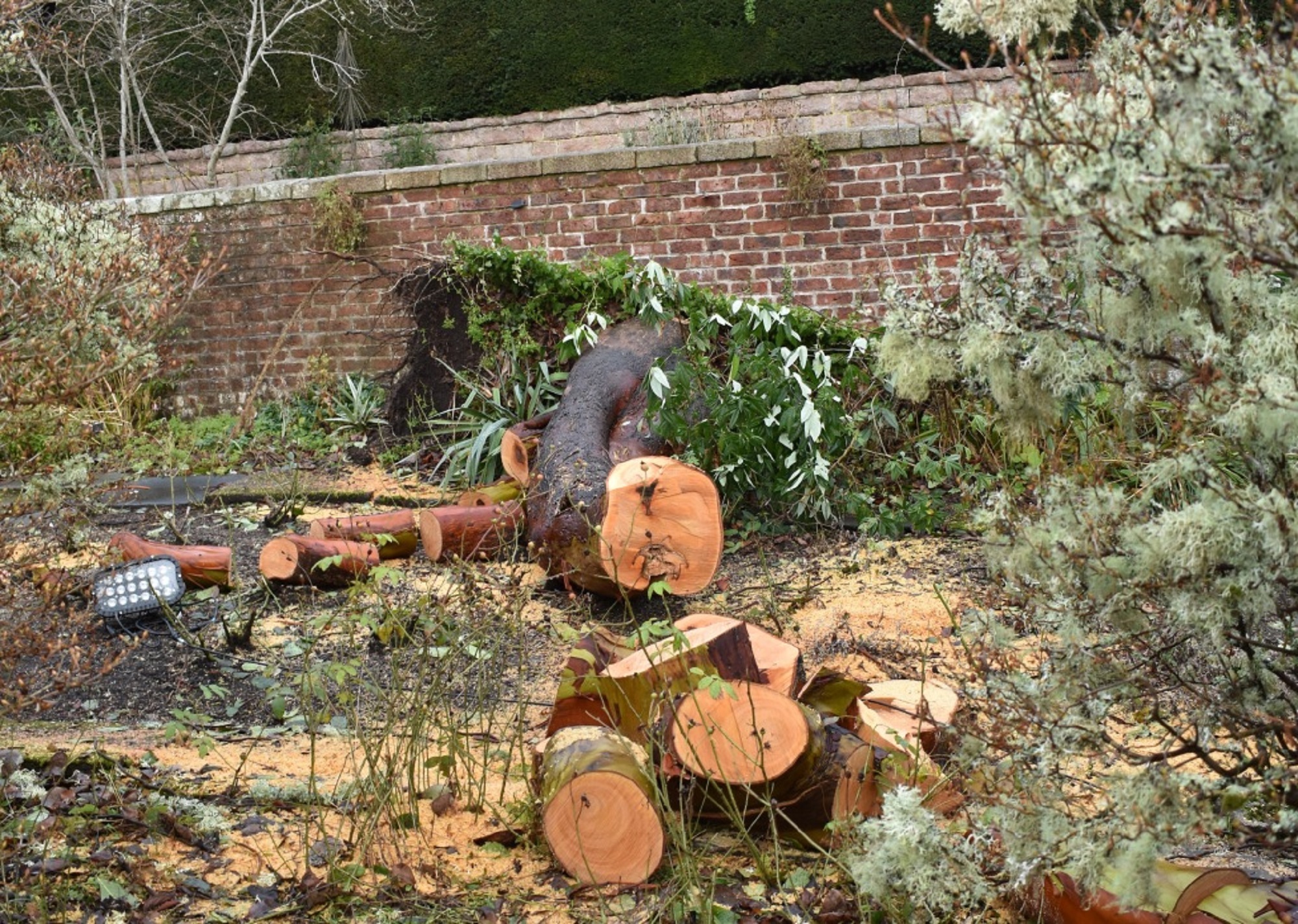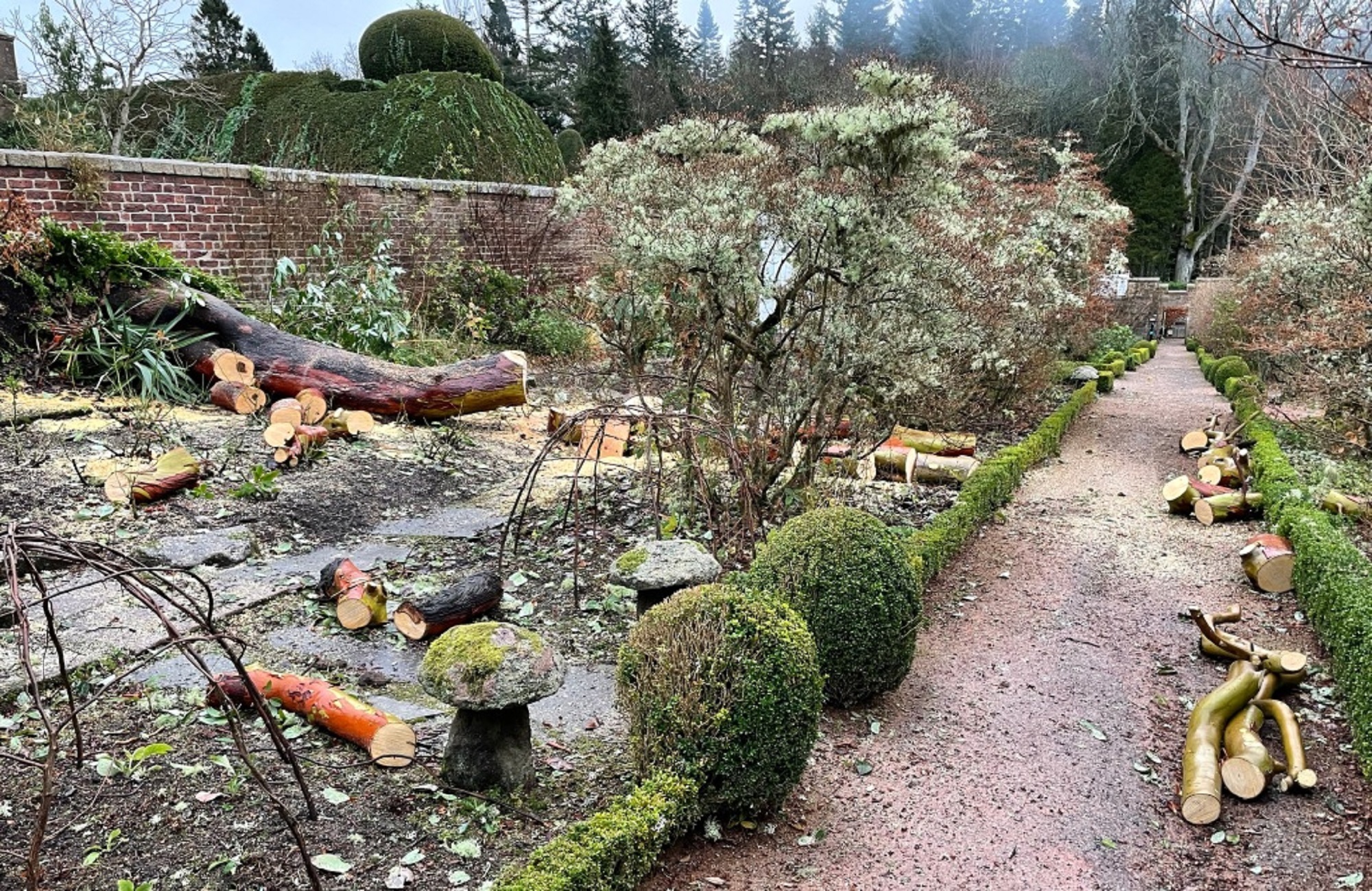 The gardeners are all exhausted. The chainsaws have been going all the time and everyone had to join in with pulling all the debris away to the bonfire. There was an urgency to get the garden safe and reasonably tidy so that the Christmas light show could go ahead, if not quite as early as planned. Fortunately, a team from Brodie Castle came down to help out at Crathes and Drum for a while.