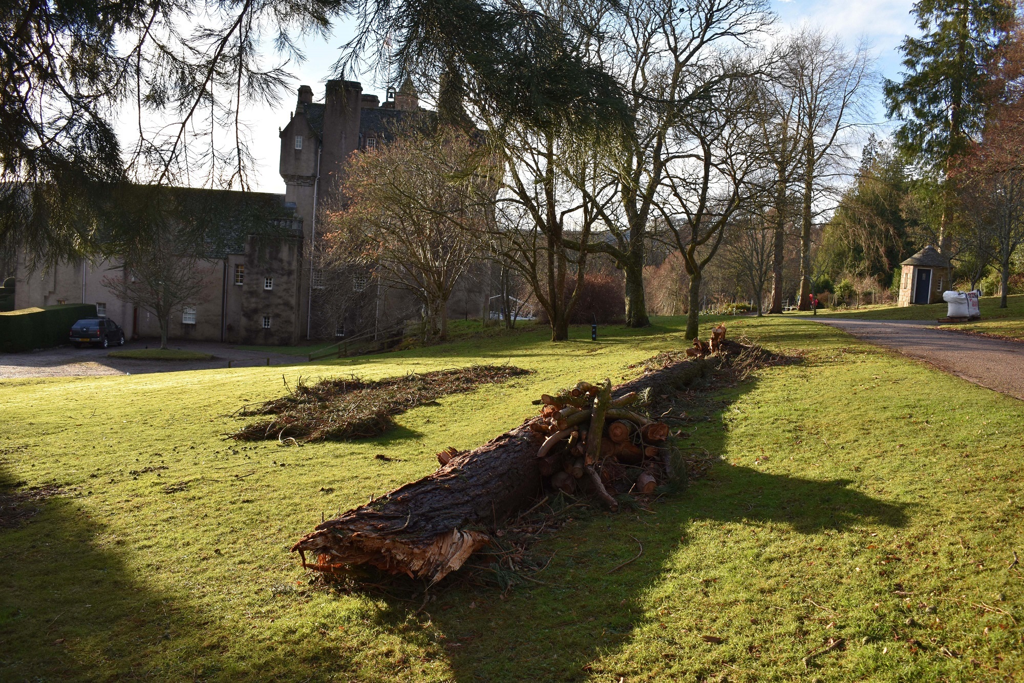 On this day my aim was to check on the specimen trees that grow around the castle, as I had heard that the old walnut tree had gone in the storm. I had seen from the car park that the giant sequoia and the massive Douglas fir to the north of the castle were still standing, but that the sequoia looked a bit sparse on one side. Passing by, I saw the mighty branch that had fallen from the tree. Roughly 12m long, it lay on the ground looking like a tree trunk itself. It impressed on me just how big the tree is – and it’s just a youngster compared to those that grow in North America. The branch had annihilated a lovely dogwood (Cornus kousa), splitting the smaller tree down the middle as it fell to the ground.