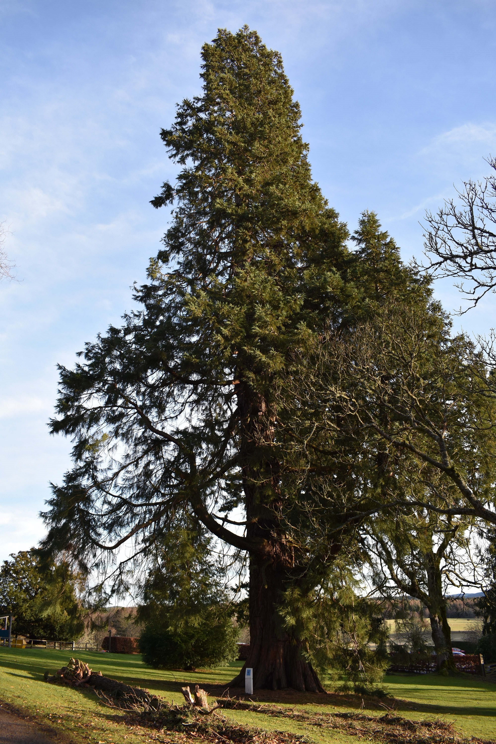 The giant sequoia quite likes the Scottish climate – the tallest specimen in the UK is to be found at Benmore (RBGE) in Argyll where the high rainfall suits it well. In the UK the trees are also known as Wellingtonias; in the USA as Washingtonias. Sequoias were first introduced in Britain in 1853, and there is some evidence to suggest that Crathes Castle and other Deeside estates were among the first recipients. [3] Many of those early plantings are still standing – sequoias rarely blow over because of their buttress-shaped trunks, but the shedding of side branches can be dangerous.
