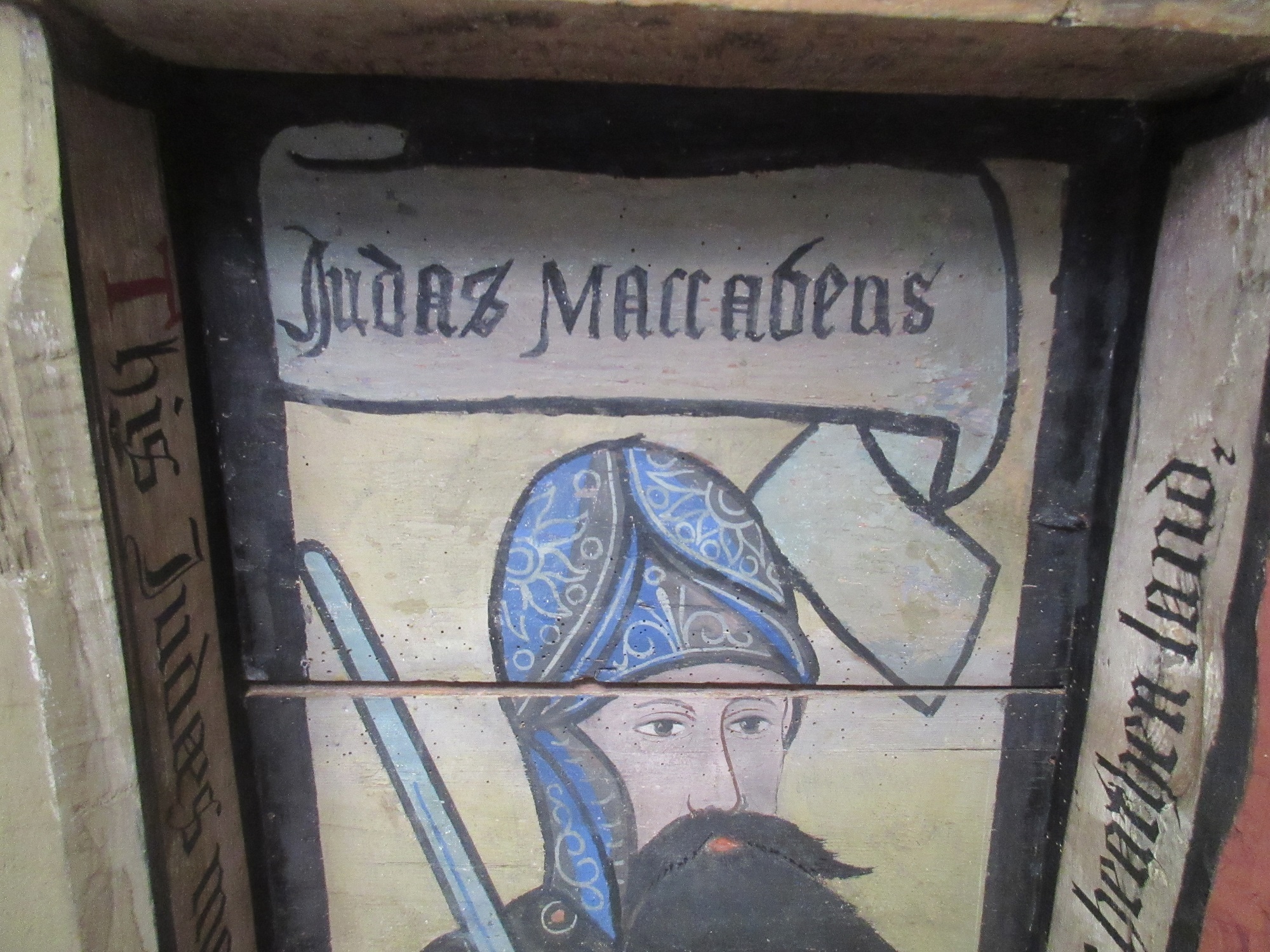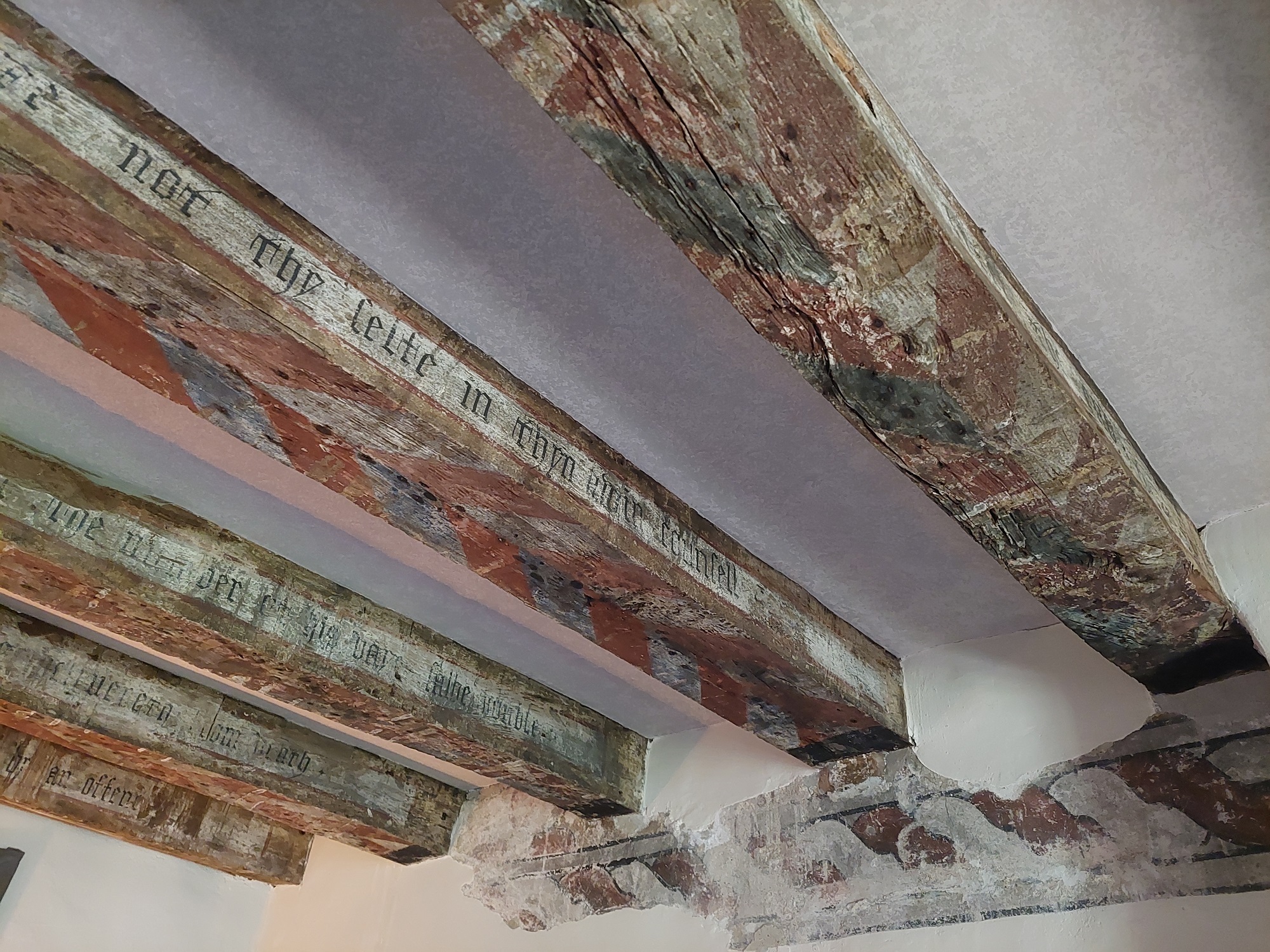 On this ceiling, figures include King David and Julius Caesar, all dressed for war, amid attributed shields of heraldic arms (awarded retrospectively). The text on the beams introduces the nobles and expresses their deeds in verse, offering clear lessons for the viewer.