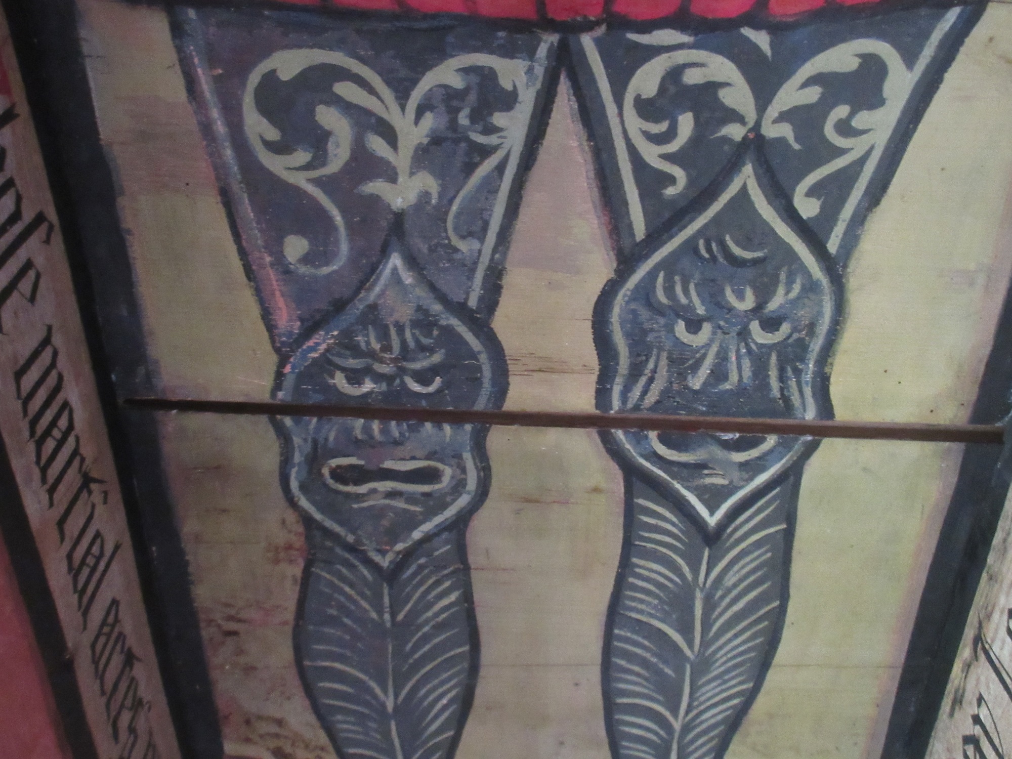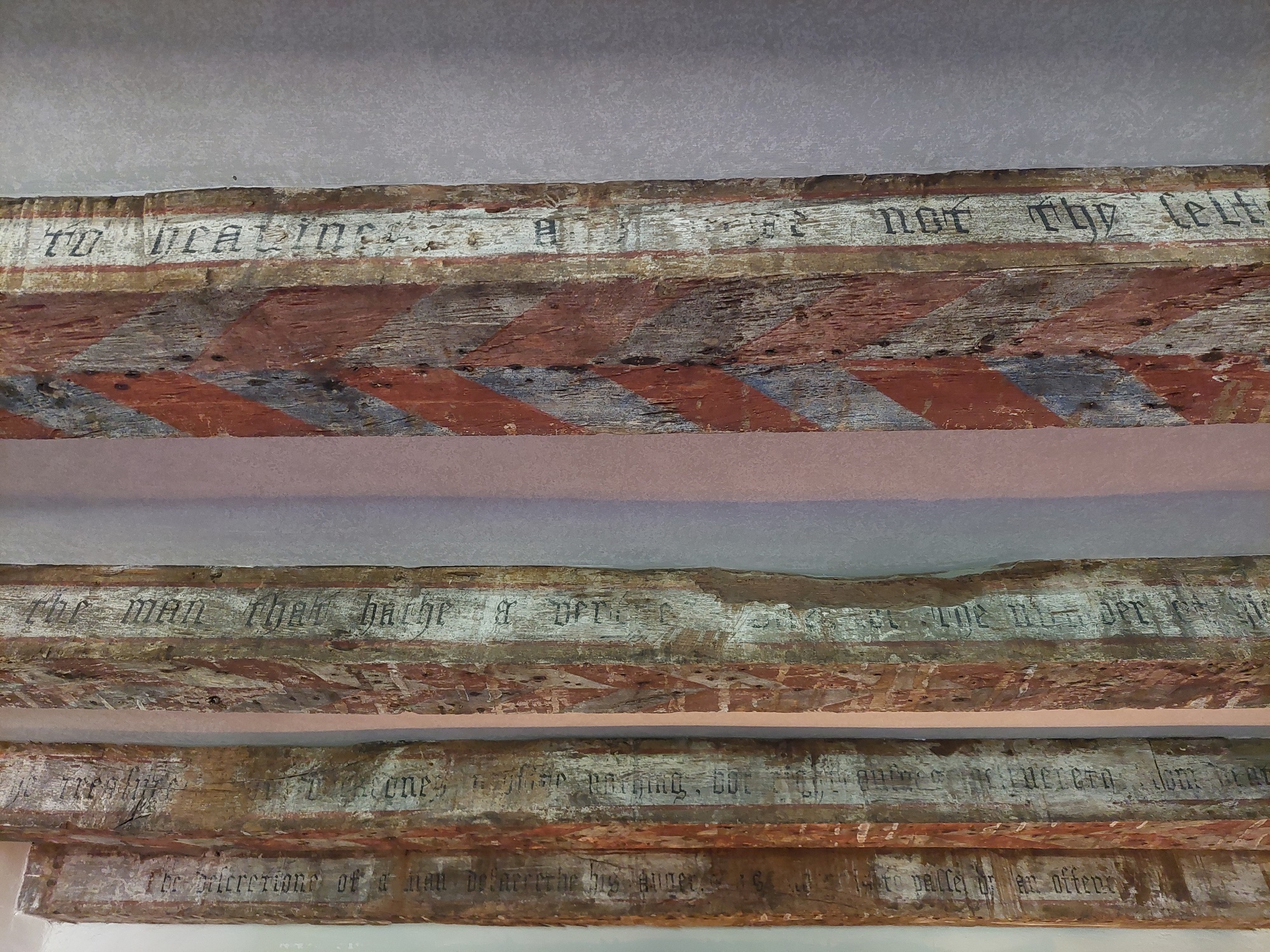 Karen and her team have worked to consolidate the stunning display in this room. Among the intensely vibrant illustrations, they have highlighted the much subtler ‘ghost text’ – it is now more visible on sections that previously appeared blank. This offers a fantastic insight into how subsequent layers of overpainting and ‘restoration’ have amended the original scheme.