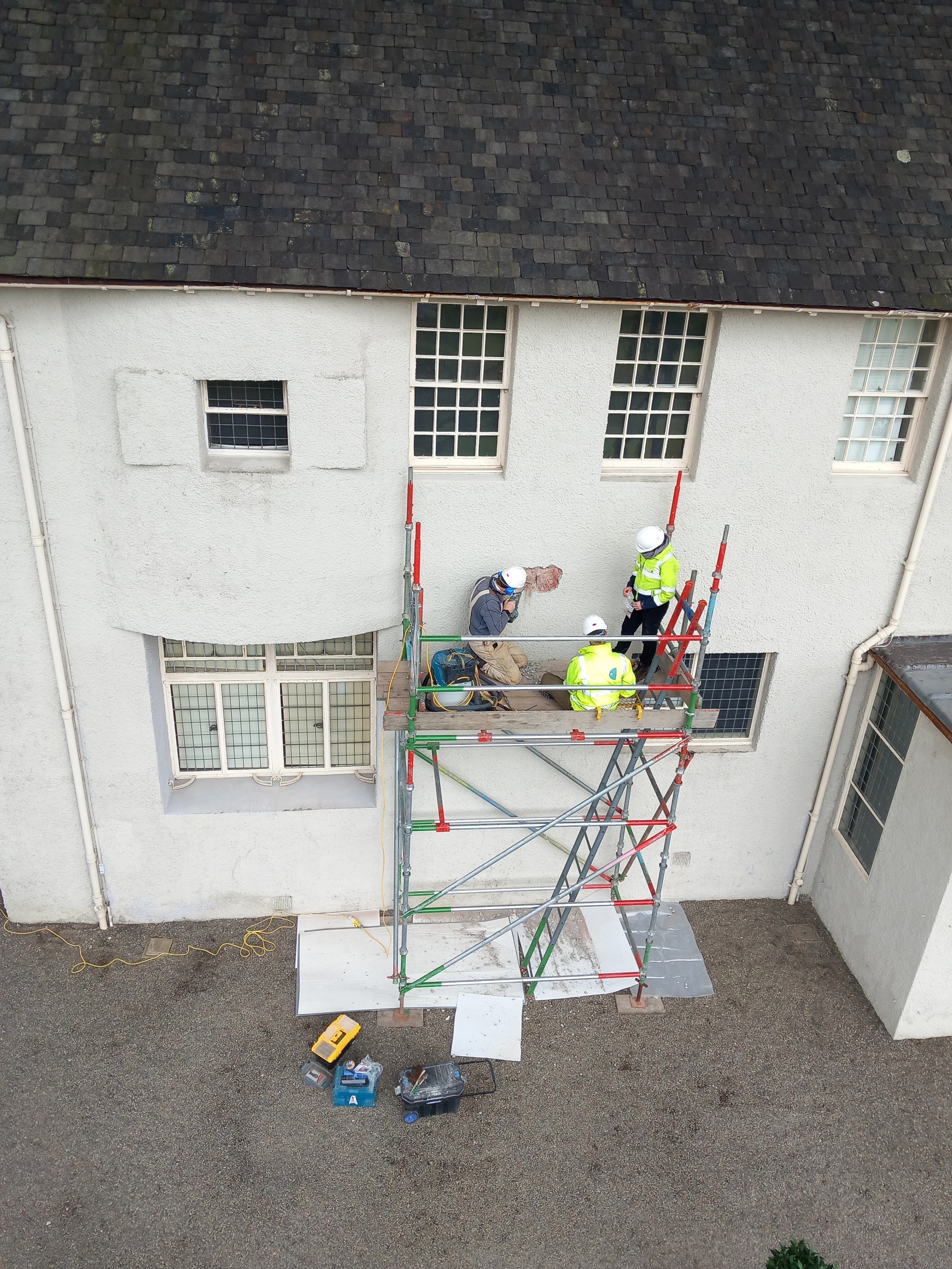 A team of engineering and conservation specialists have carefully recorded the condition of the walls and have overseen the excavation of areas around the building to examine the core of Mackintosh’s construction. The team meticulously removed the Portland cement roughcast in six locations around the building to reveal the substrate beneath, including what is thought to be the original damp-proof course, red sandstone and brick walls as well as details of some of the repairs made in the last century.