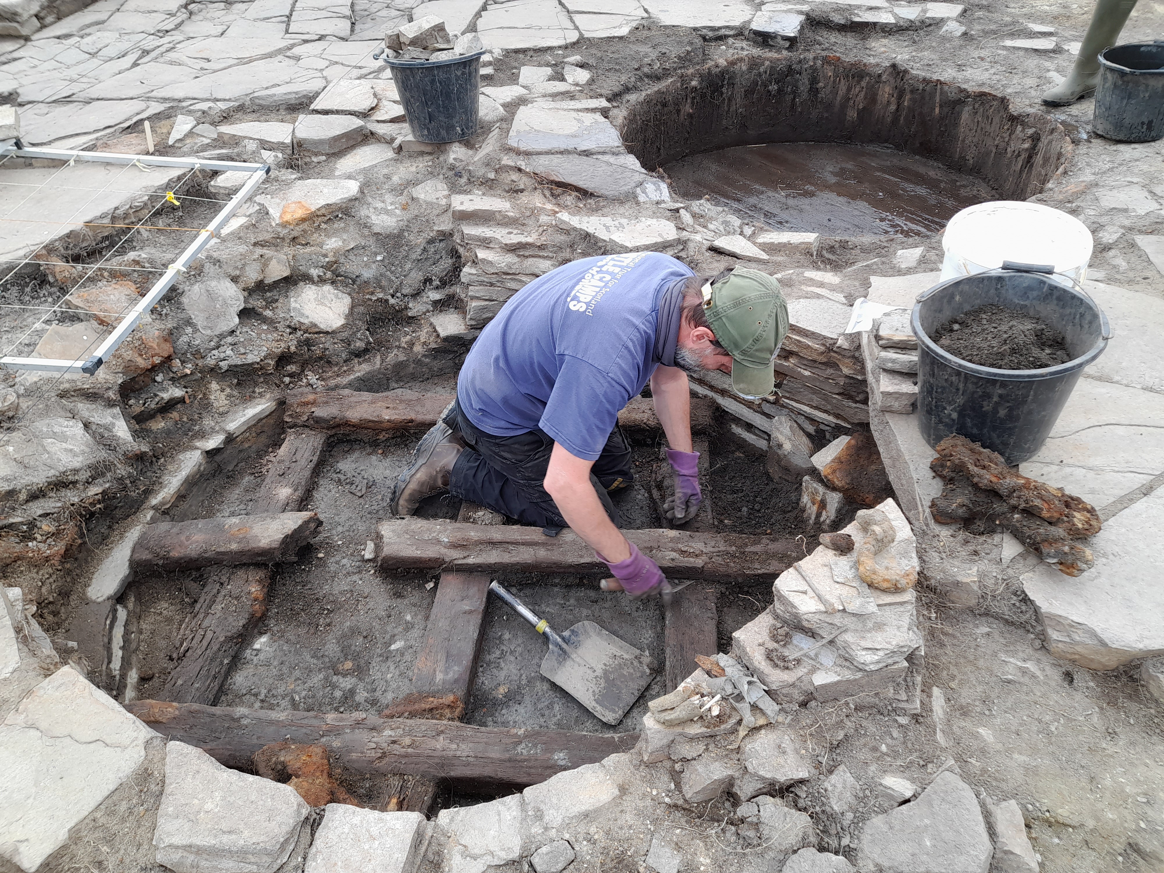 Set into the floor in front of the stills were the remains of an oak vat, which has been interpreted as the ‘underback’, a wooden container into which the liquid from the mash tun would have been drained and allowed to cool before it was pumped into the wash-backs where yeast was added. It was allowed to ferment into beer. There were other telling traces immediately to the east of the spirit still: two circular features, one stone-lined and the other outlined by an iron barrel hoop, but both of which have two levels of timbers forming a raised support for vats. These are thought to mark the positions of the two ‘receivers’, where the distilled alcohol was tapped off from the stills having passed through the copper spiral worm and cooled down with running water.
