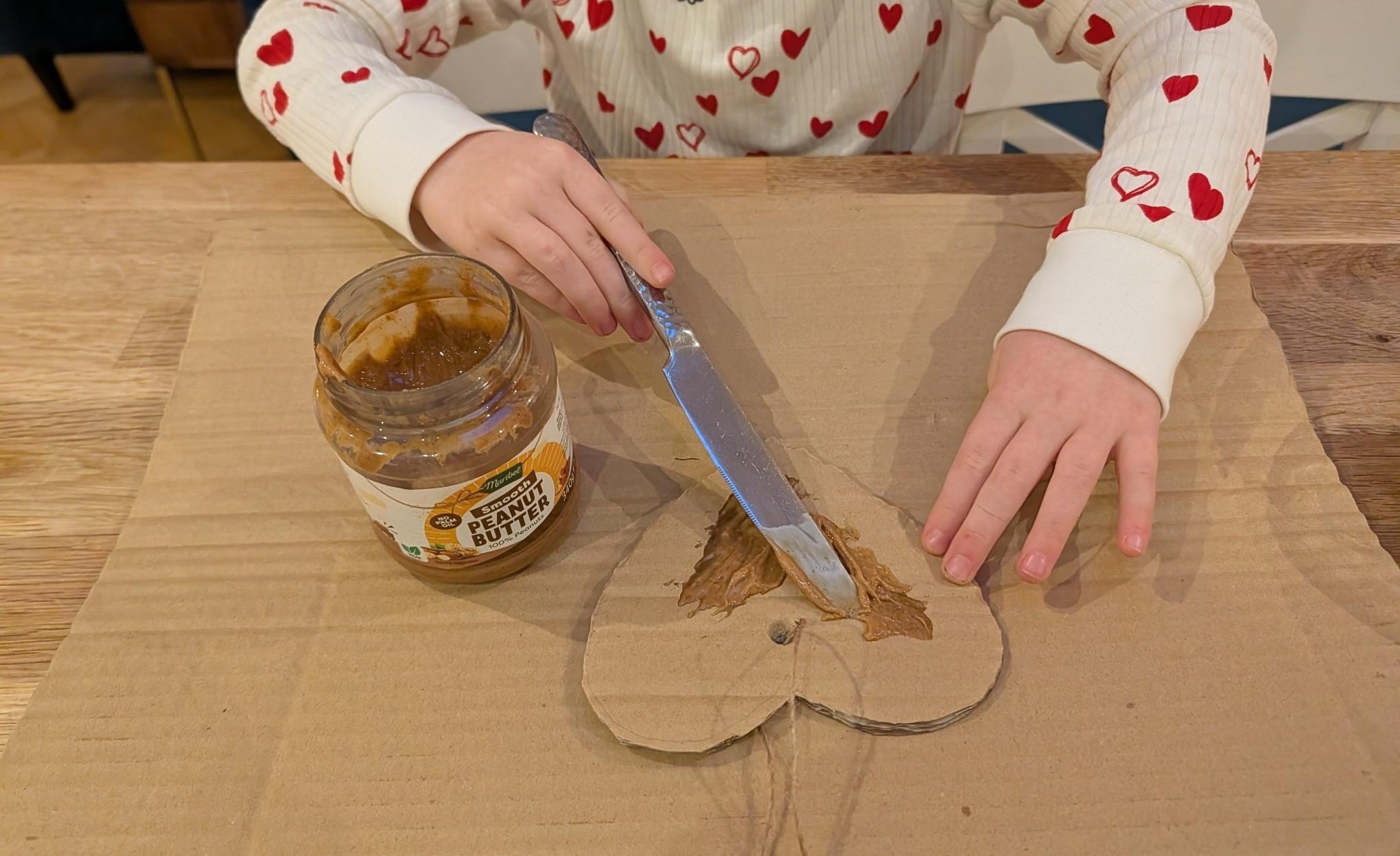 Spread nut butter on one side of your cardboard heart.