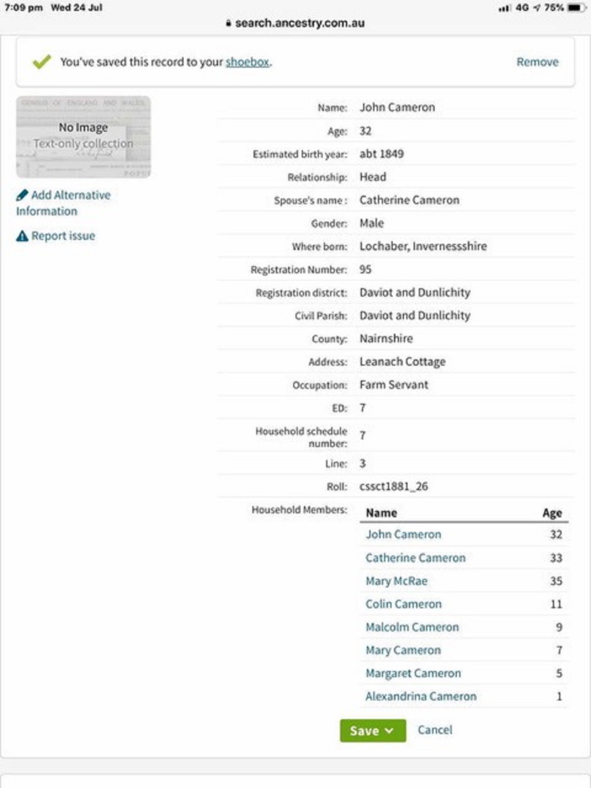 Only since I have been working on my family tree have I found my 2nd great-grandfather was John Cameron. I have attached the census for 1901 showing that he was a farm servant at Leanach Cottage. So, you can see why I am very excited about coming and seeing where he lived. I know that the cottage there now is a rebuild after a fire.