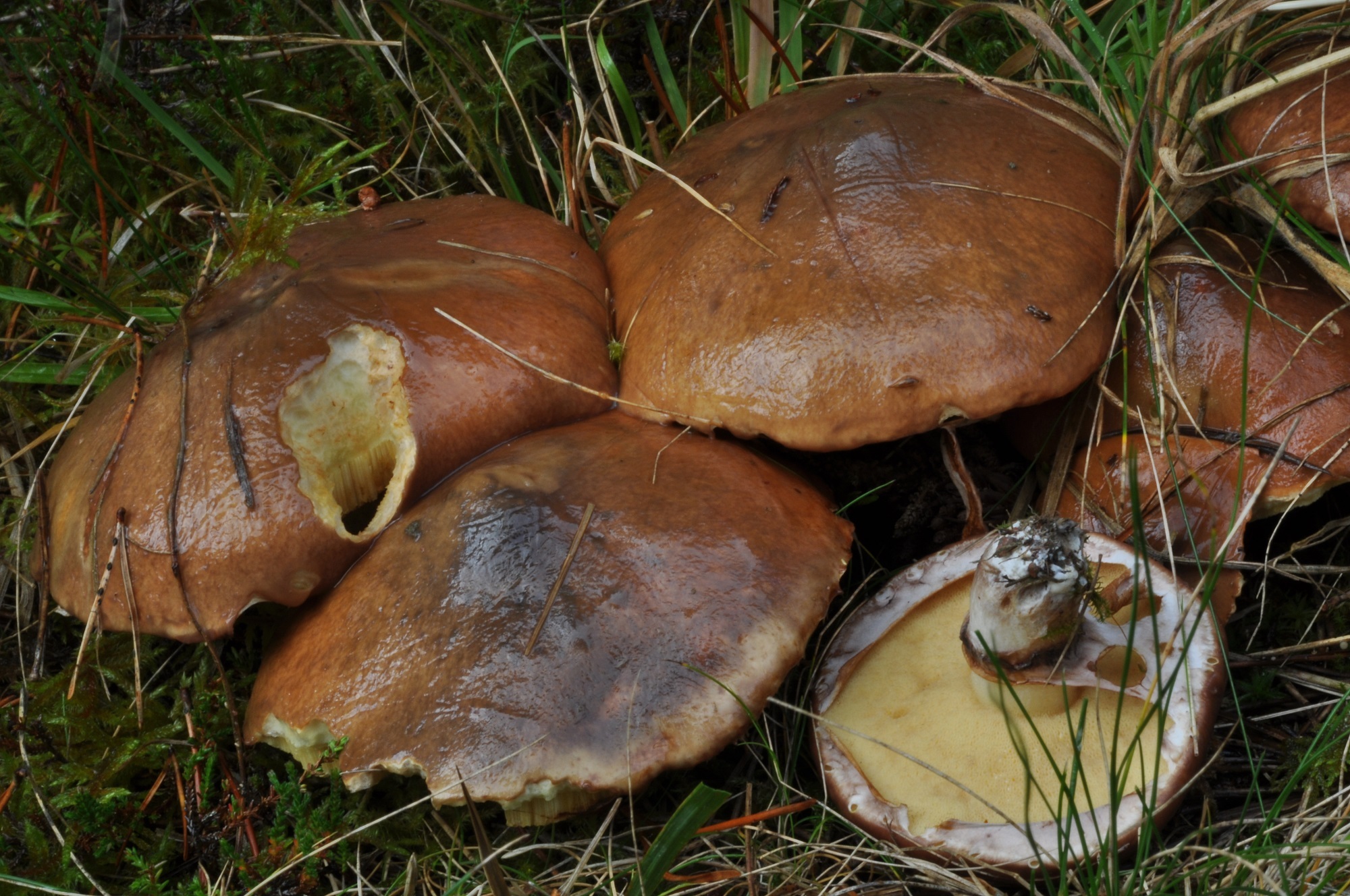 There are more tube mushrooms to be discovered. Under the birches round the car park are the similar but more slender fruit bodies of the brown birch bolete (Leccinum scabrum), easily distinguished by a covering of black granules over the surface of the white stem. Very common under the pines is the slippery jack (Suillus luteus), well-named for its very slimy orange-brown cap, which has a shorter stem with a ring on it. Inverewe Garden also used to contain the yellow-capped larch bolete (Suillus grevillei), which will disappear along with the larch as the felling to control larch die-back continues.