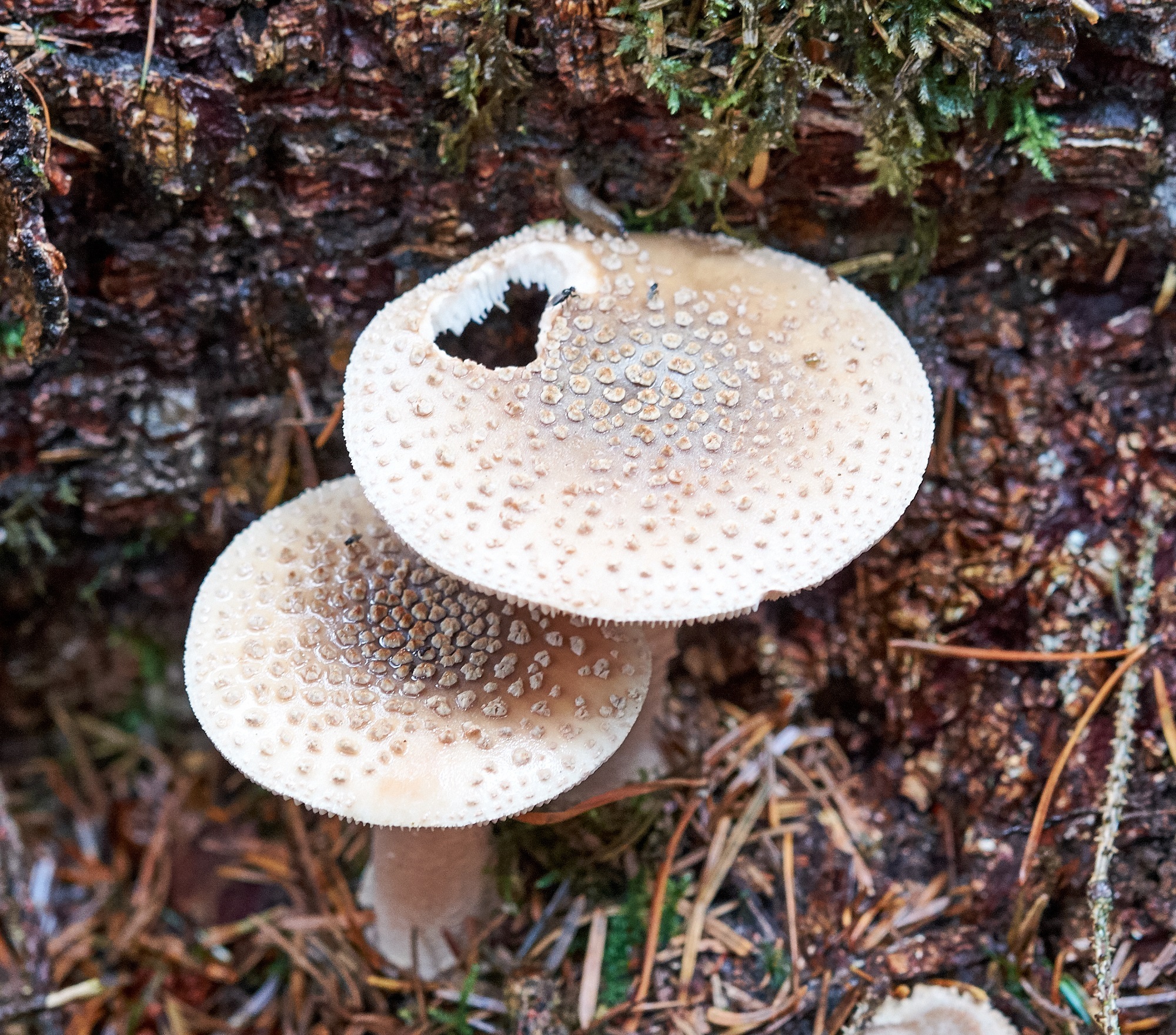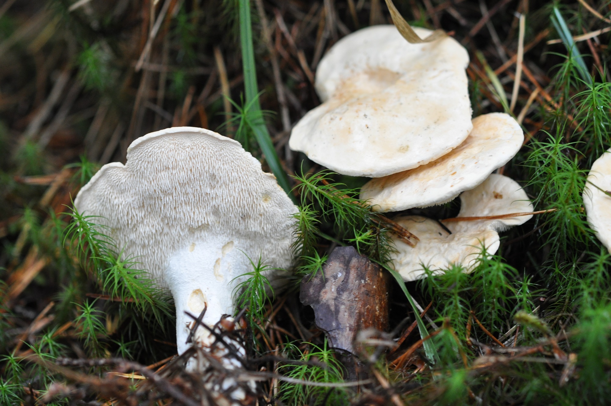 Also common along the trail under the pines are the uneven, pinky-orange caps of the terracotta hedgehog (Hydnum rufescens), often found growing in fairy rings. It looks like a gill fungus, but turning it over reveals the underside is covered with short and very fragile minute spines, hence the name. Like the chanterelle this is a very good edible species.