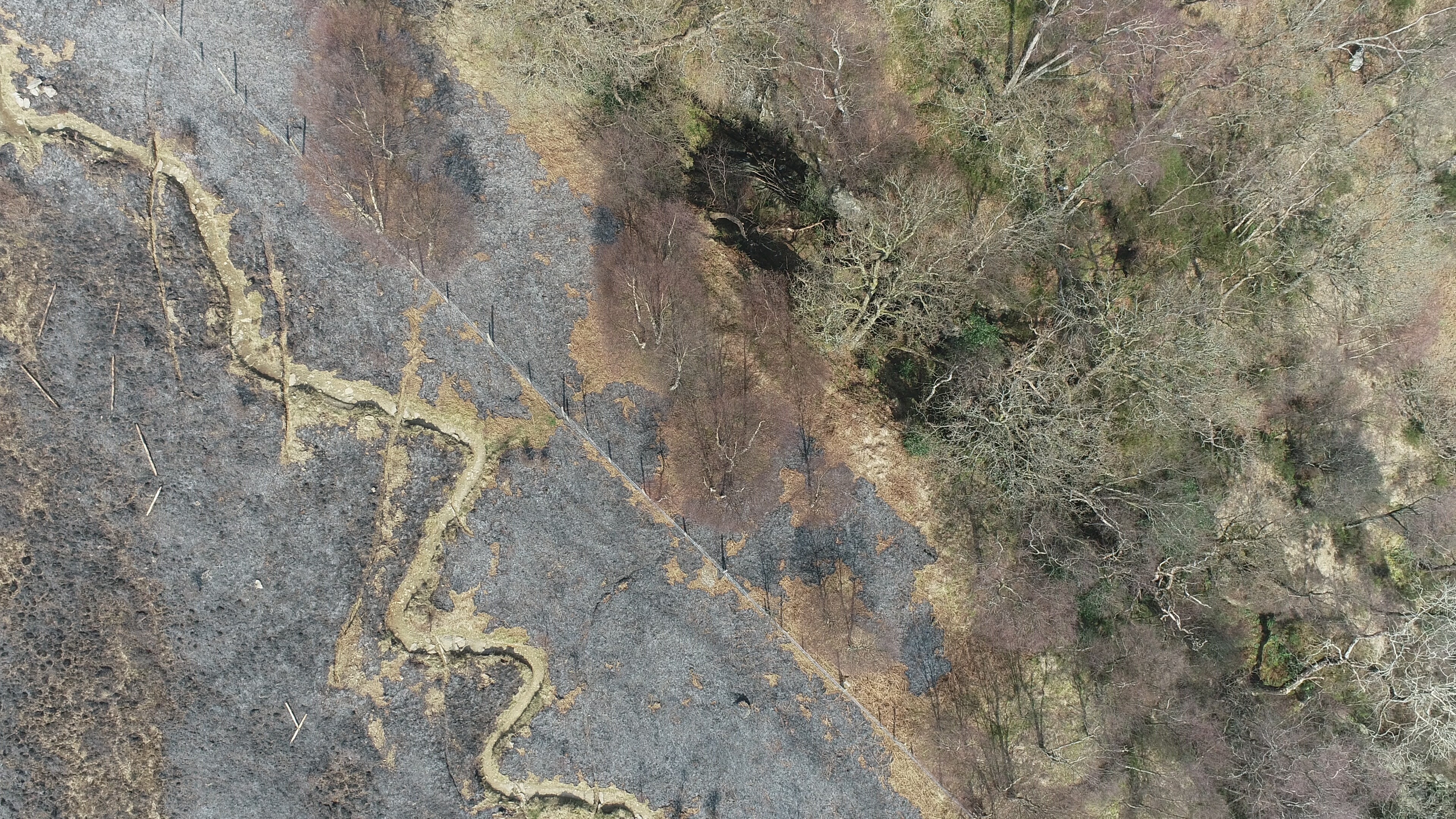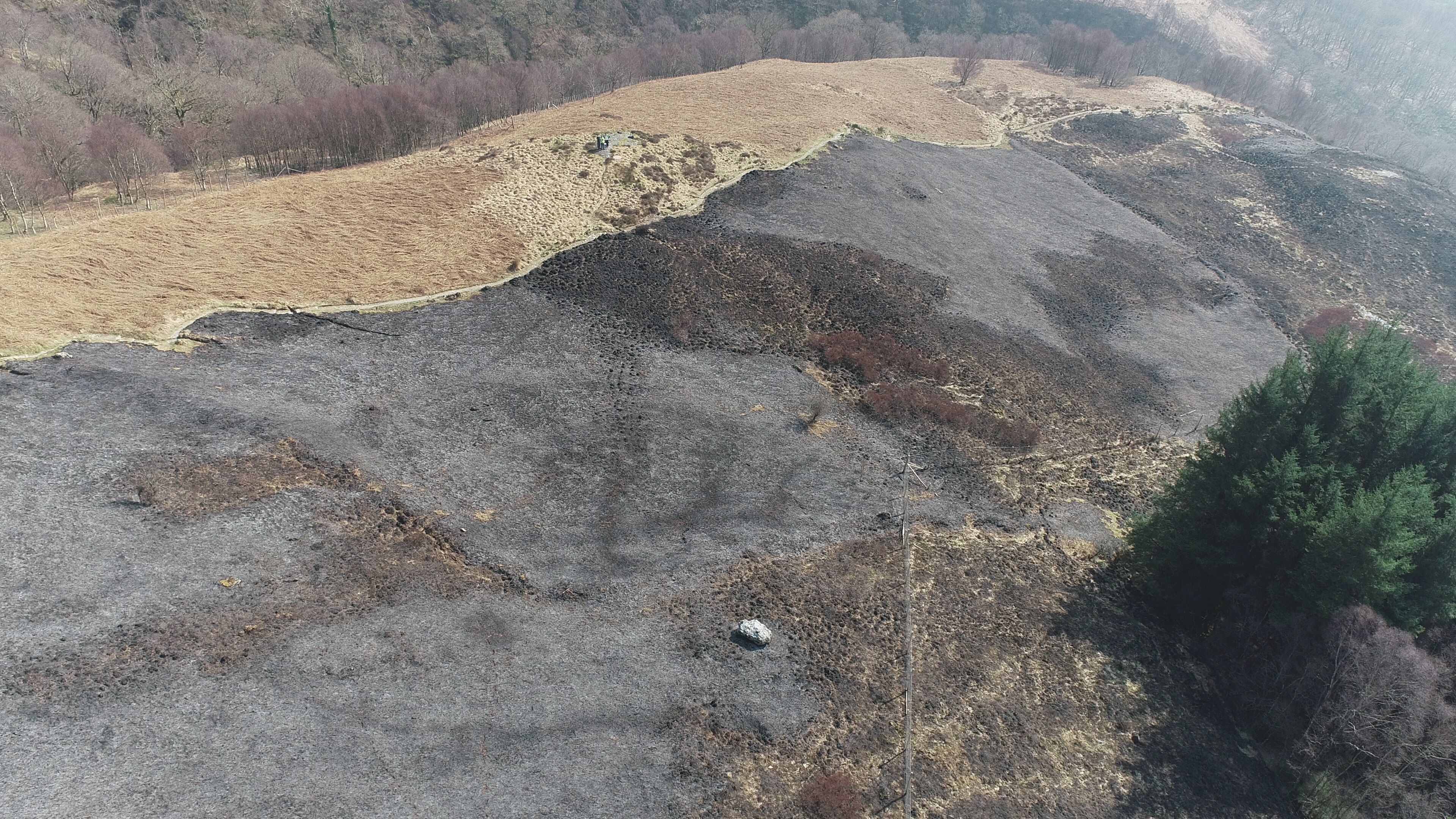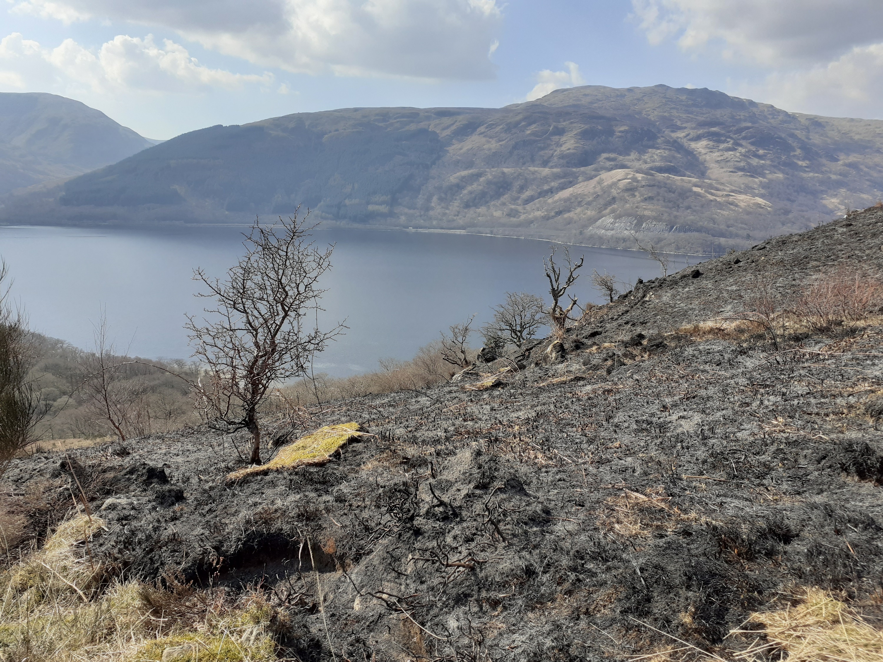 It was devastating to see this fire take hold and spread so quickly. This can be a very high risk time of year for hill fires, with the dead grass and bracken from the previous year an easily ignited source of fuel during prolonged periods of dry weather, and no fresh, green growth yet to dampen down the risk. The amount of dead vegetation had also increased because this slope had been fenced off, to exclude both deer and sheep and enable natural woodland regeneration to have a chance. The fence was completed in 2020, after many weeks of hard work from contractors, the ranger service and volunteers, and the response from trees and scrub across the slope was really encouraging to see. Unfortunately, although the fire does not at first inspection seem to have damaged larger trees, the younger growth from the last couple of years since the fence was completed has taken a real hammering.