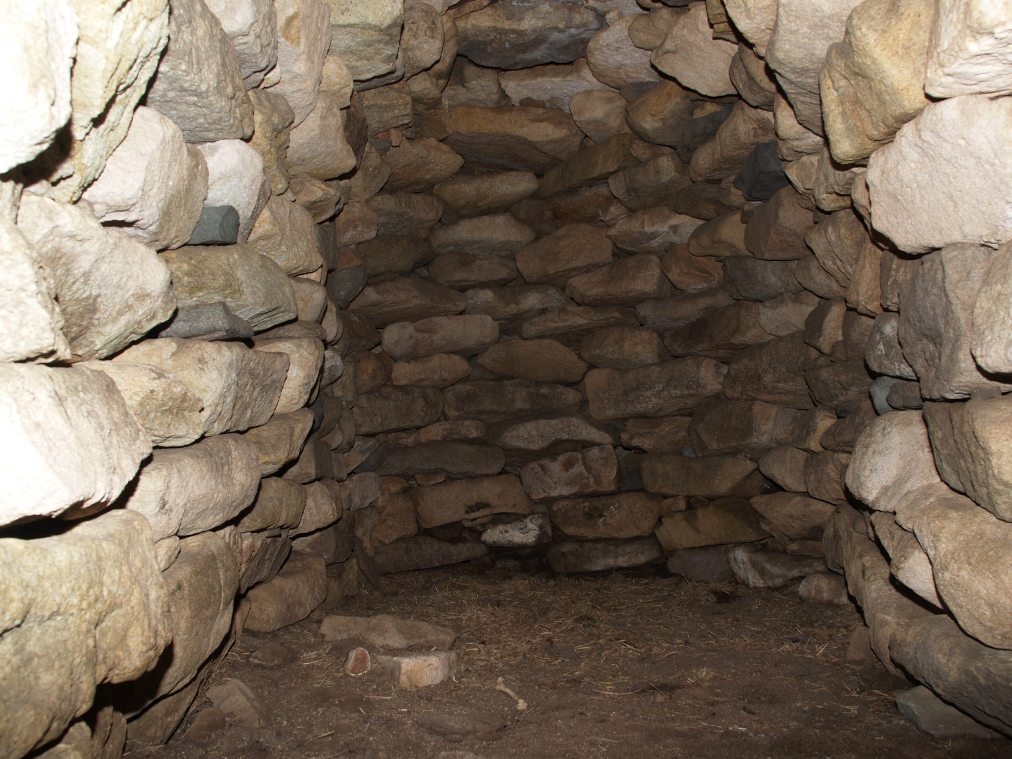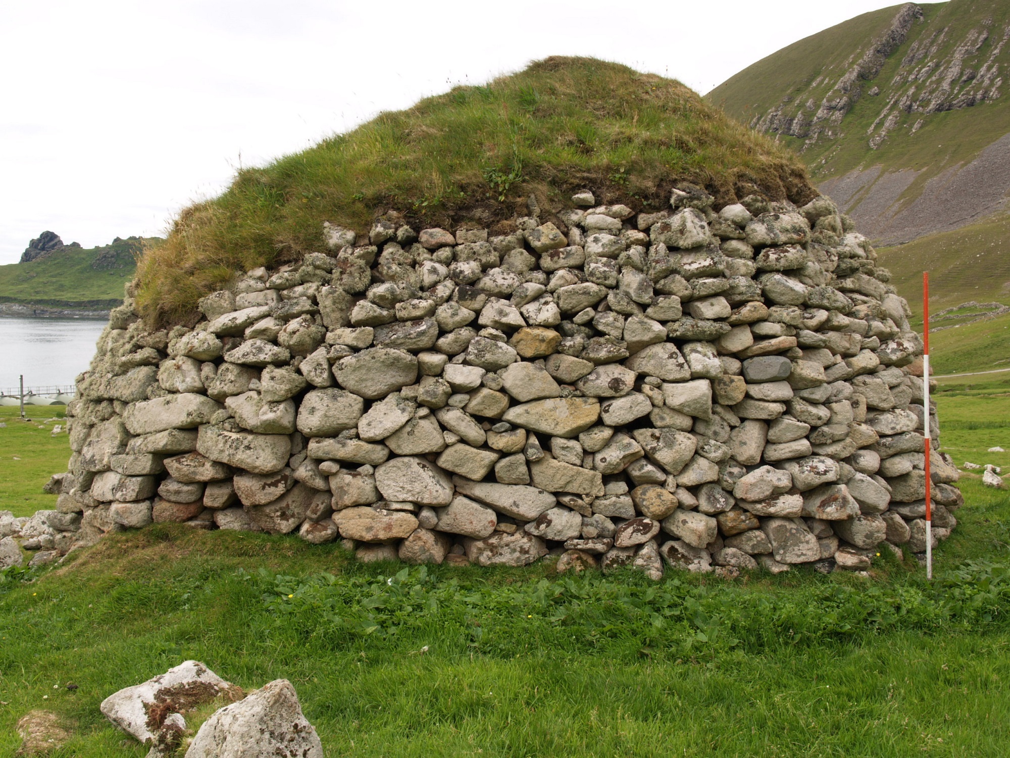 Despite considerable variations in size, amongst other things, the construction principle of all the cleitean is remarkably similar. They typically have two ‘skins’ of stone, which are not keyed into one another. The outer face is random, uneven and has no apparent coursing. Externally they look crude, seemingly crafted by unskilled hands without reference to aesthetics or basic structural integrity. But this assumption is a falsehood that is immediately apparent when you look inside. Here, an internal stone skeleton, coursed and regular, rises with an even outward lean that transfers the weight of the huge roof lintels down and out onto those rough, irregular external walls. The roof is piled with soil and smaller stones beneath a turf cap (alone it may weigh several tons). This provides both weatherproofing and further weight to the corbelled arch of the interior. The external wall can collapse repeatedly, but the internal skeleton will remain strong as long as the damage is repaired in good time.
