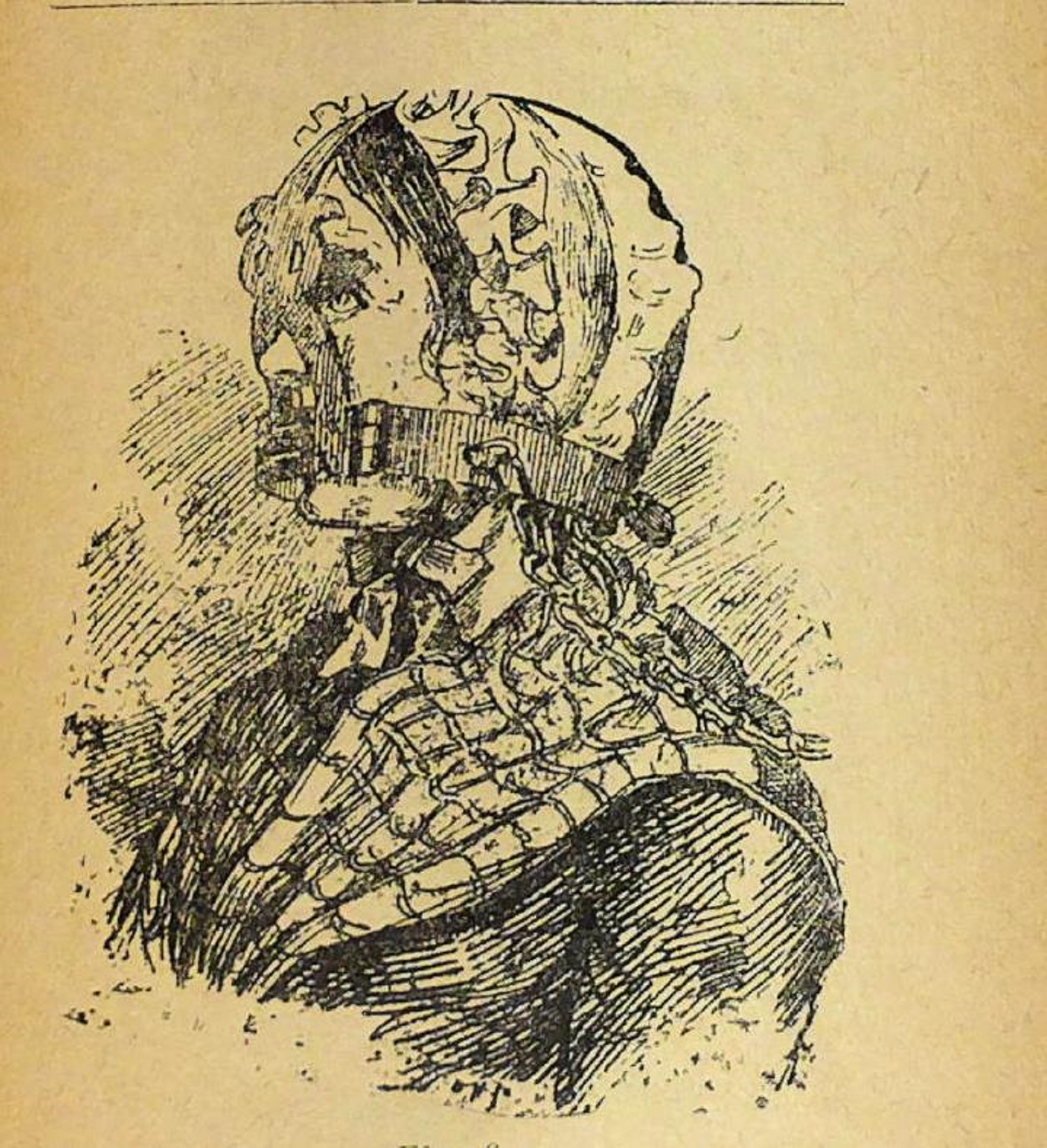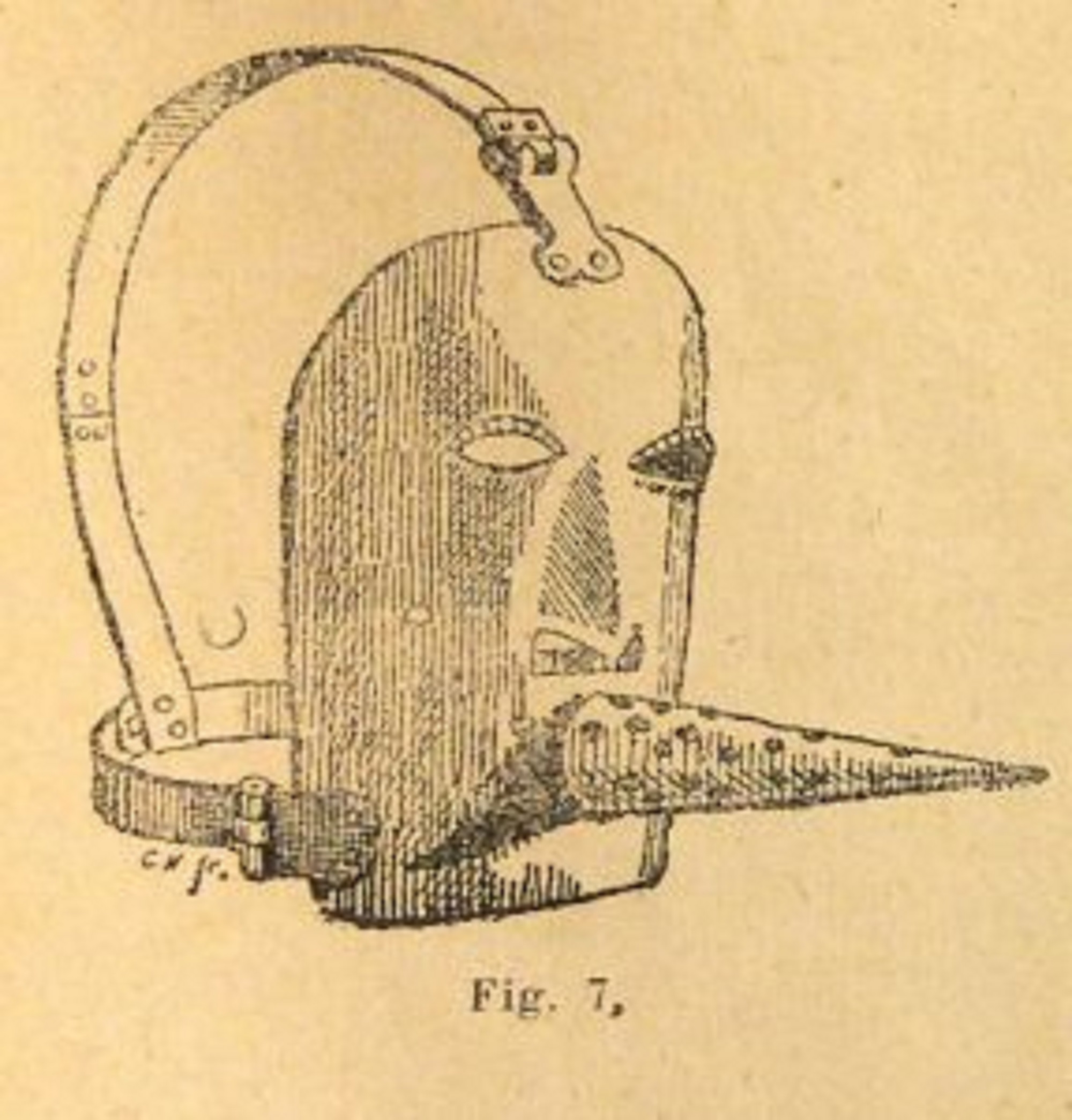 Other versions were made by a multiplication of hoops, more like a cage, with the front forming a mask of iron with holes for the mouth, nose and eyes. Sometimes the mouth-plate was armed with a short spike, to cut into the tongue if it was moved. A particularly cruel bridle was made with a long spike protruding from the mouth-plate into which the tongue was forced to curl, making breathing unnatural and deliberate.