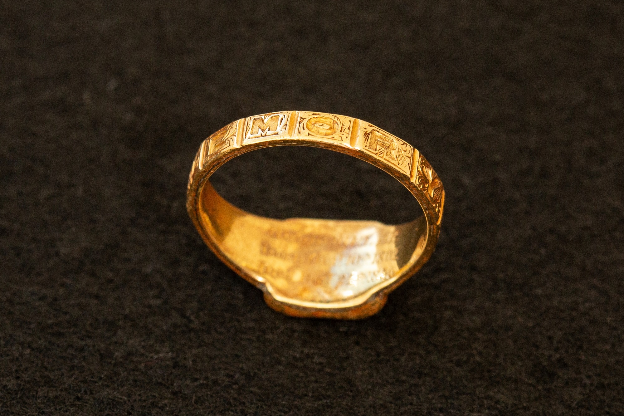 The ring was found by local detectorist Cornell Swart on a beach in Gordon’s Bay, South Africa. Mourning jewellery was common in Miller’s time. This ring, made of 18ct gold, features the inscription ‘In Memory Of’, which would likely have been filled with black niello (a metallic alloy). On the inside it is delicately engraved with ‘Hugh Miller Born Octr 10th 1802, Died Decr 24th 1856’.