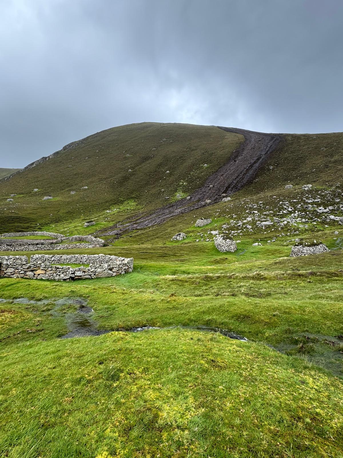 Tons of mud and stone were swept down the hillside, damaging some of the unique cleits and demolishing drystone dyke enclosures at the bottom of the slope.
