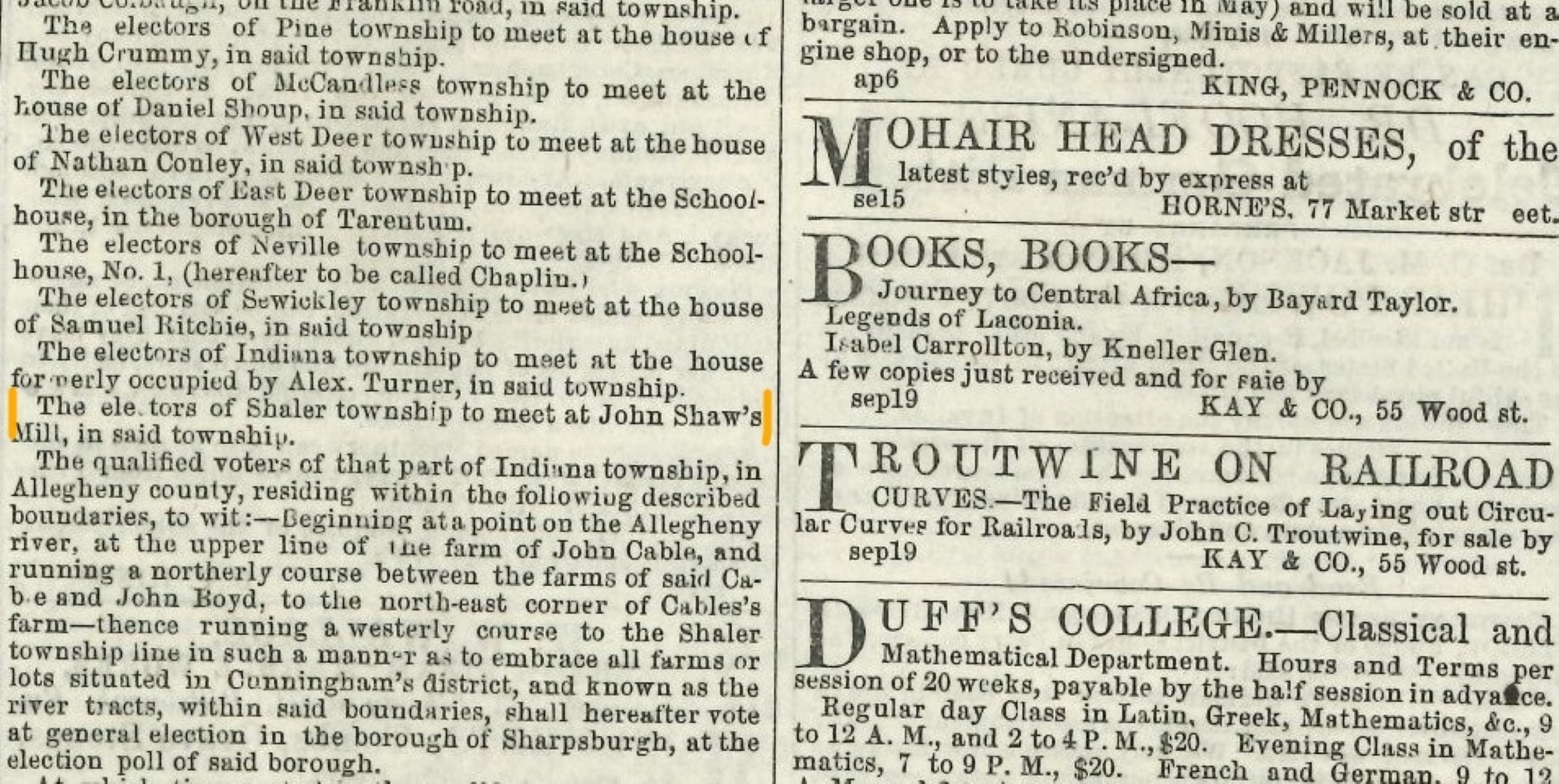 Following Thomas Wilson Shaw’s marriage to Sarah Scott (1799–1879), daughter of Colonel Samuel Scott of nearby Perrysville, in 1824, he had built a substantial brick house on his property in which he raised a large family. This was to become the Shaw family home, Glenshaw, which gave its name to the Glenshaw township of Allegheny County today, a suburb of Pittsburgh. Stone for the house was hauled from a local quarry, and interestingly the stonemason for the construction was the nephew of iconic American frontiersman Daniel Boone. The house’s location became known as ‘the Plank Road’ because it was originally built from thick wooden planks and was only cobblestoned in 1925.