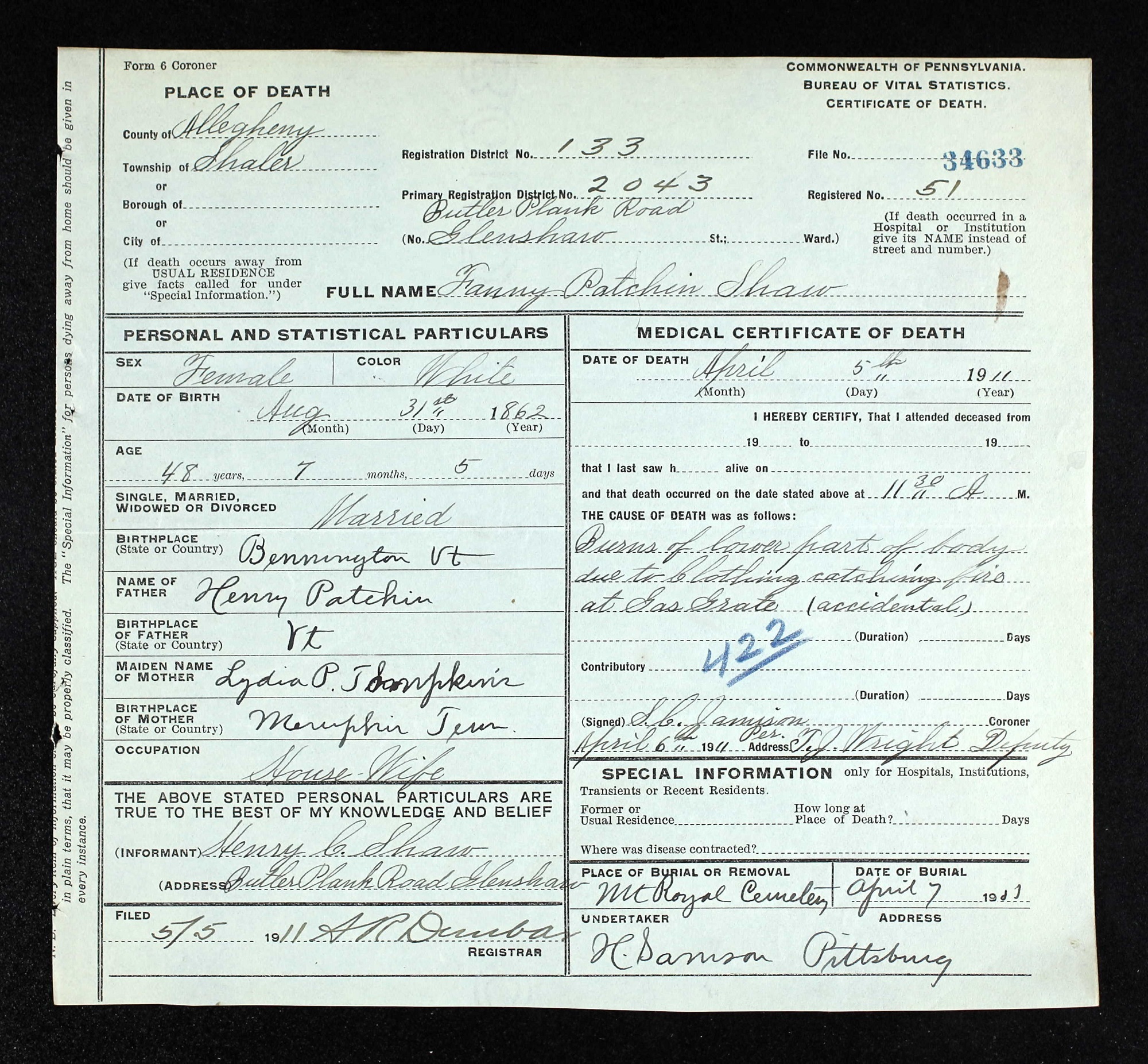 Margaret’s mother died at the early age of 48 in 1911, as the result of a tragic accident at home. Her clothing caught fire on the gas grate and she died due to ‘burns of the lower parts of her body’. Margaret, aged 7, was devastated as were all the girls and their father, who never really recovered fully from Fanny’s death. Henry decided to move the family away from Glenshaw to Sewickley on the Ohio River, where he had sisters and brothers to help him with the girls. Margaret’s father died suddenly ‘due to an attack of acute indigestion’ (the death certificate lists cause of death as angina) on 26 September 1915 in Sewickley, at the age of 60, and was buried in Glenshaw.