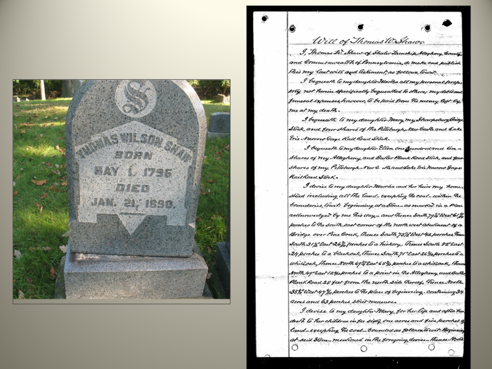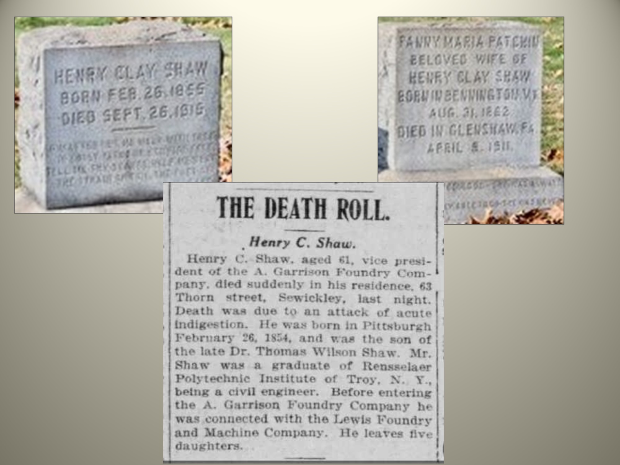 Thomas married Catharine Wolfe Stoner and they had six daughters: Elizabeth, Margaret, Sarah, Mary, Martha, Ellen; and 5 sons: George, Harry, Thomas, Woodward and the eldest, Henry Clay Shaw, born in 1854. Henry was Margaret’s father.