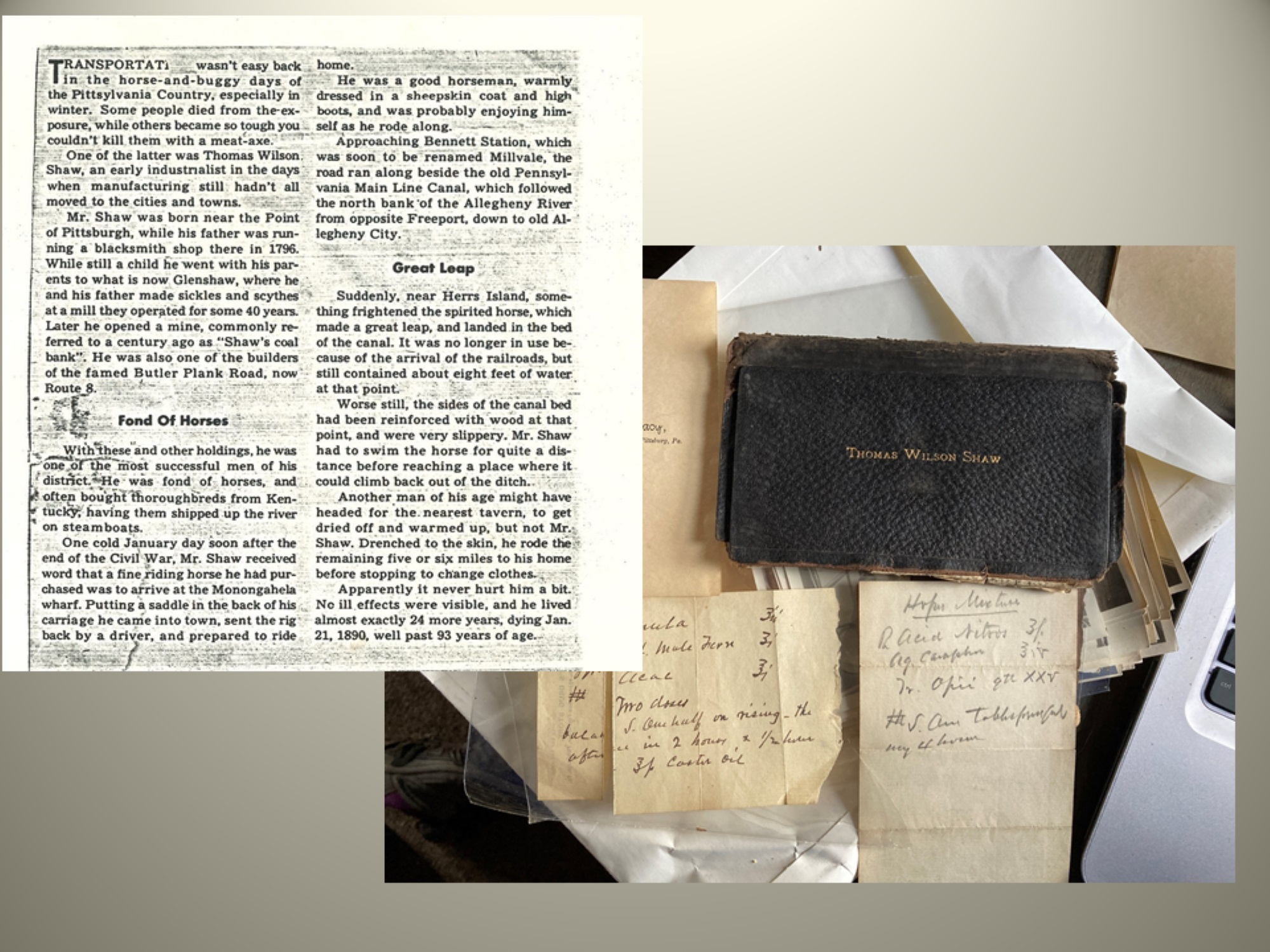Thomas Wilson died on 21 January 1890 at the age of 96. His first child was Thomas Wilson Shaw (1826–99), Margaret’s grandfather and a leading physician who attended the Battle of Gettysburg in 1863 as a surgeon. He would later become well-known for the invention of his Dr Shaw’s Little Black Devils purge pills! He was also a much-loved doctor for the immigrants who came to work in the steel mills. He was known for never sending out his bills as well as for his determination and ‘true Pittsburgh grit’.