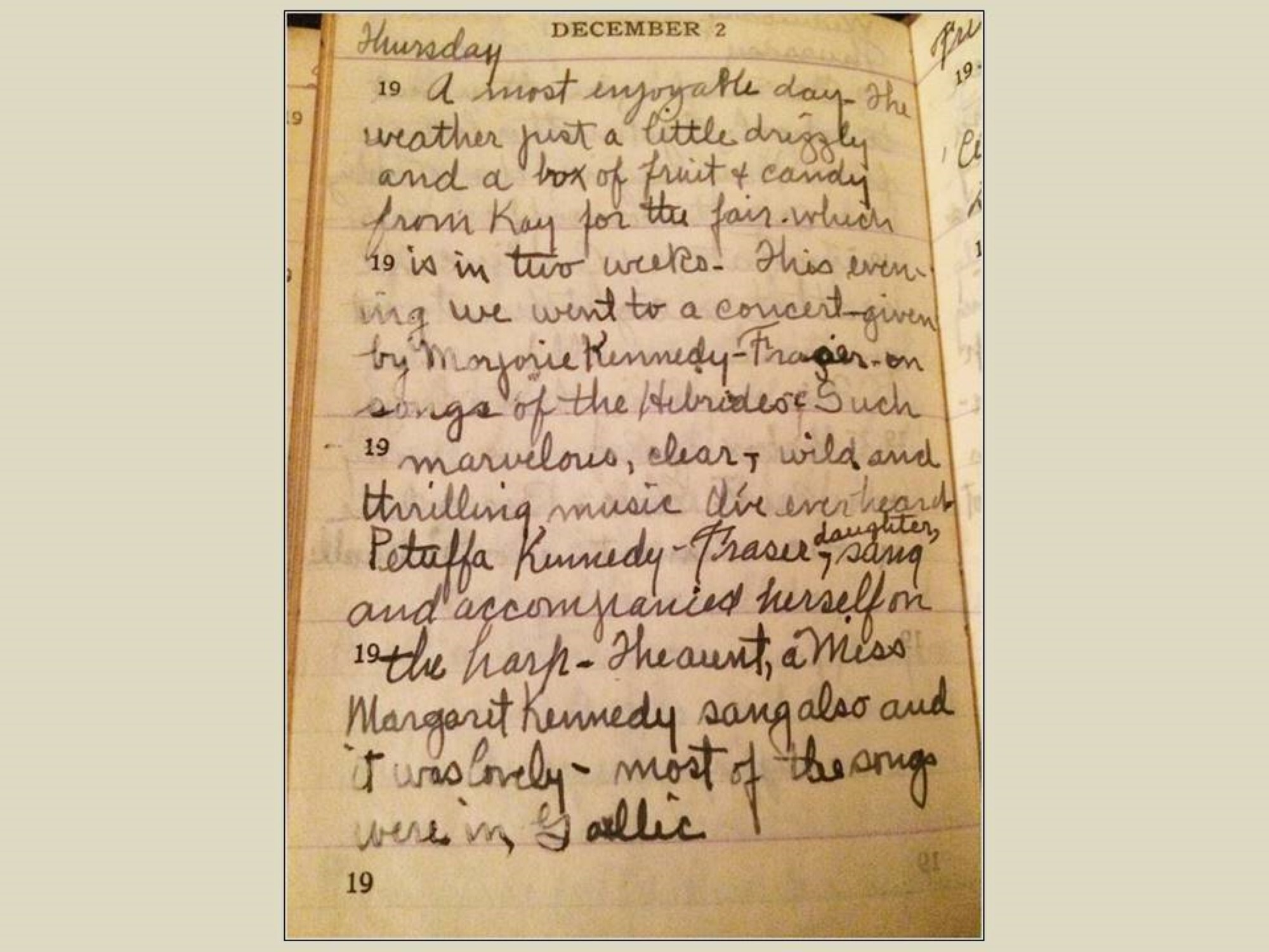 A most enjoyable day. The weather just a little drizzly and a box of fruit and candy from Kay for the fair which is in two weeks! This evening we went to a concert given by Marjorie Kennedy-Fraser on Songs of the Hebrides.
