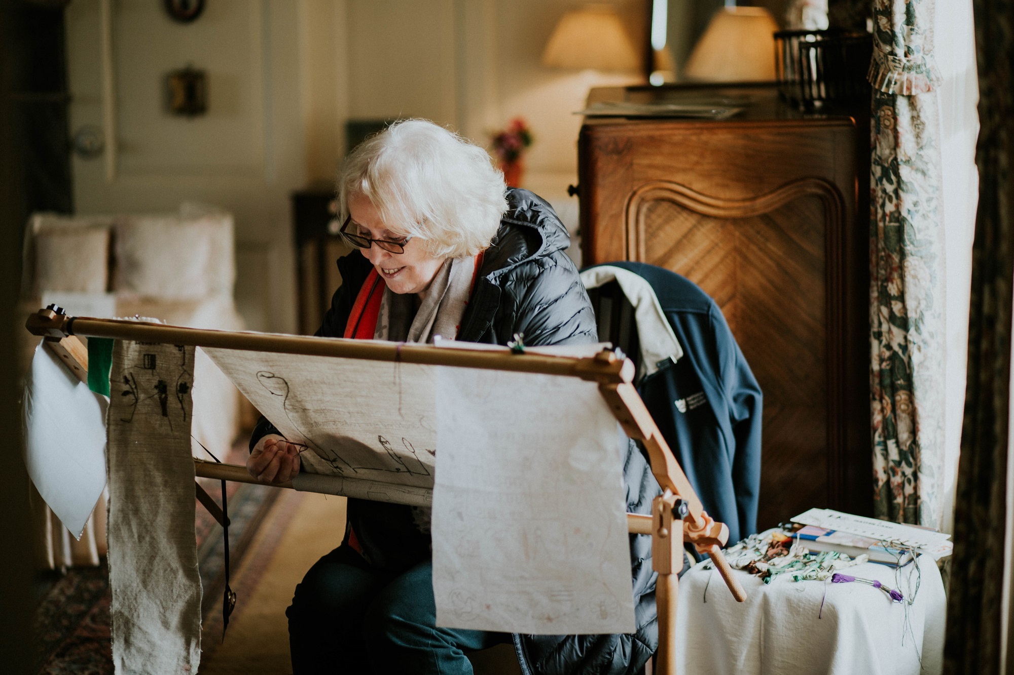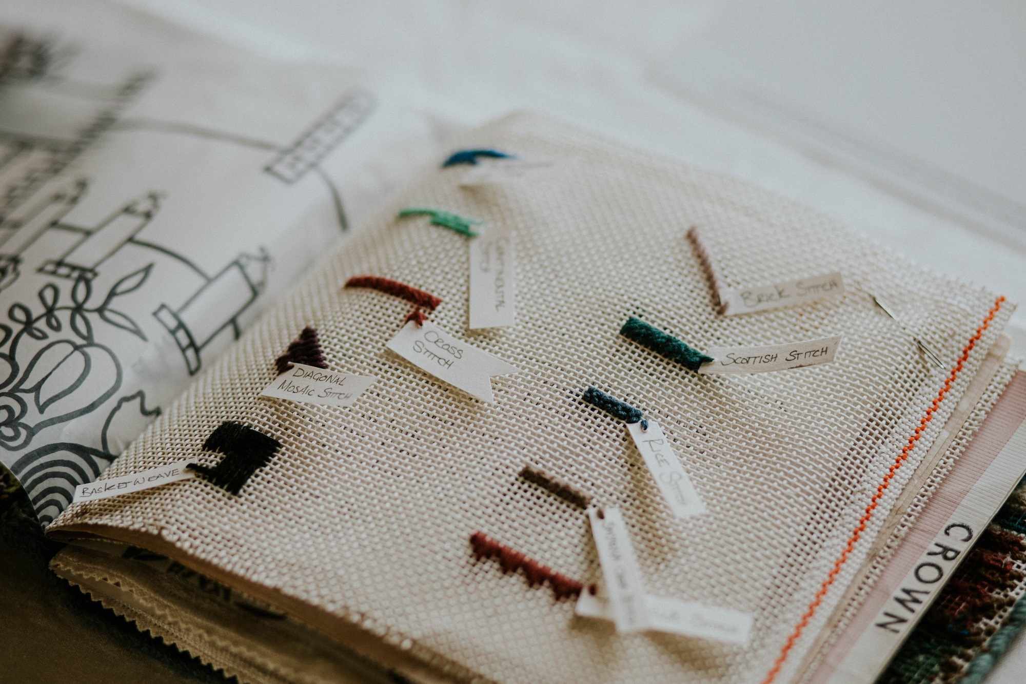 All needleworkers know that you need good light for stitching, so we positioned the tapestry stand by a window. We also created some supporting materials to share our plans, consisting of our stitching plan, preliminary designs, and a stitched piece of fabric with some of the stitches included in the design. We turned these materials into a book that people could sit down and look through it.