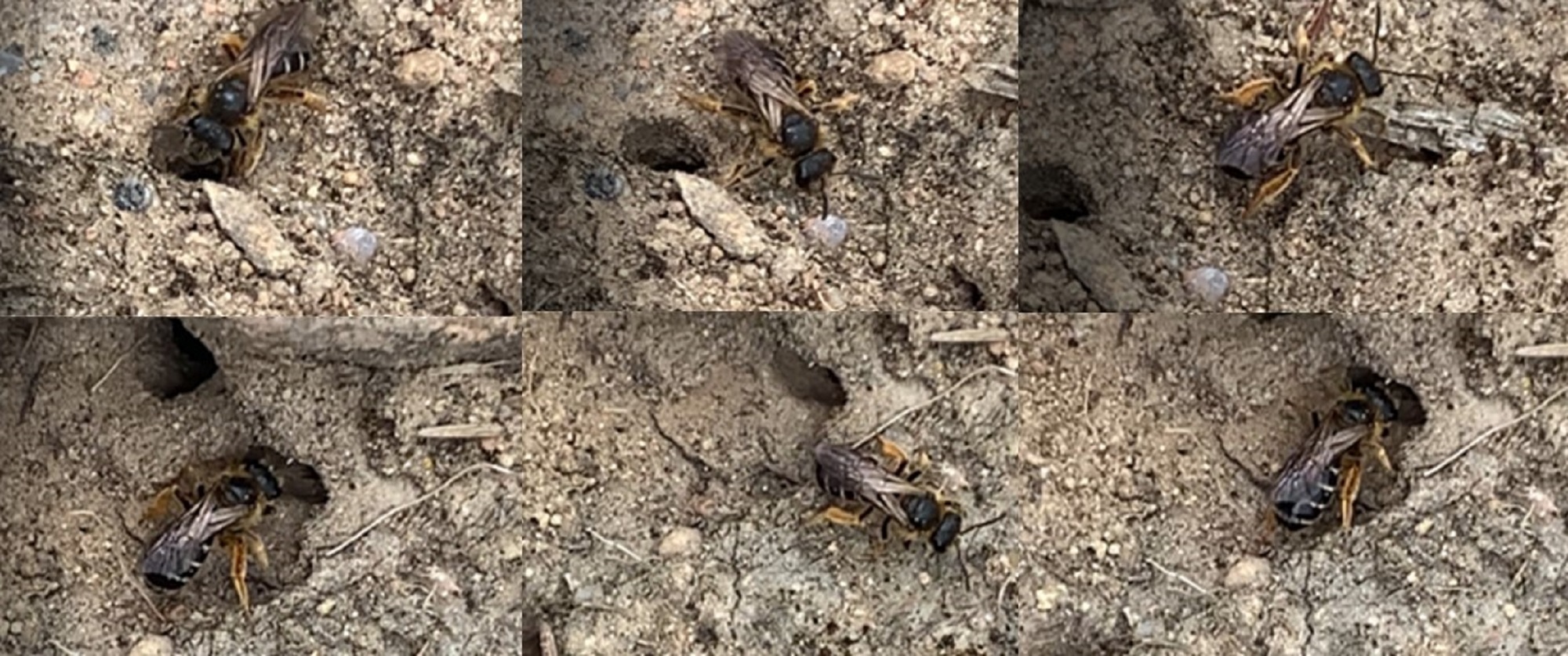 And so why do mining bees mine? Well, maybe it’s for protection. Since they are solitary bees, they lack the benefit of safety in numbers. They may share burrow entrances but they will always have separate accommodation underground – there’s a lot going on beneath those tiny holes in the path.