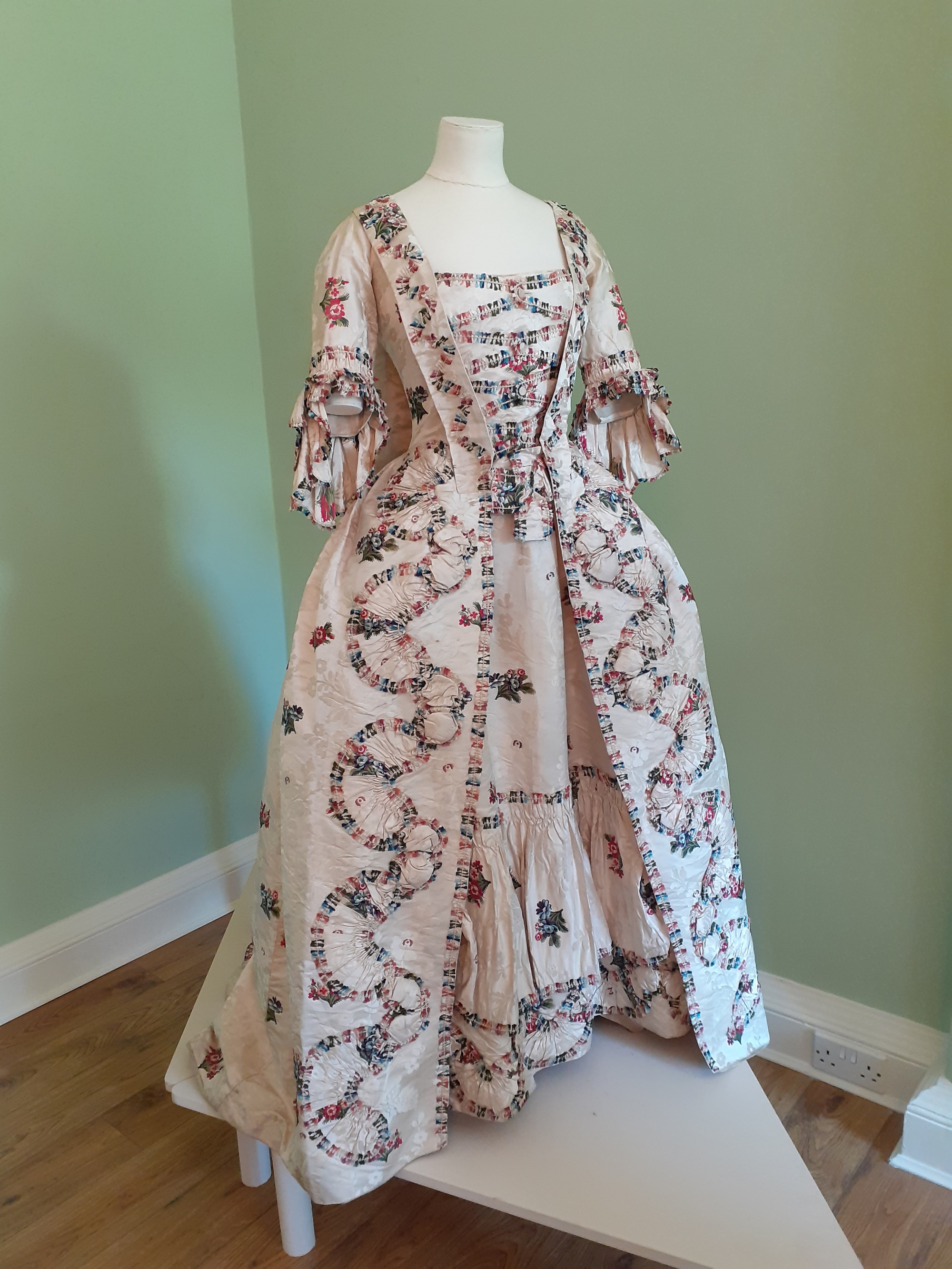 A very special item is our sack-back gown, dating to the 1760s/1770s, with embroidered flowers and delicate appliqué features, still vibrantly colourful 250 years after it was made – largely due to it having been kept in dark storage for a number of years. After careful consideration, this dress was placed on open display in the exhibition, outside of a protective case. This is the first time it has been displayed like this since the 1960s, and so it came with benefits and risks that need to be managed.